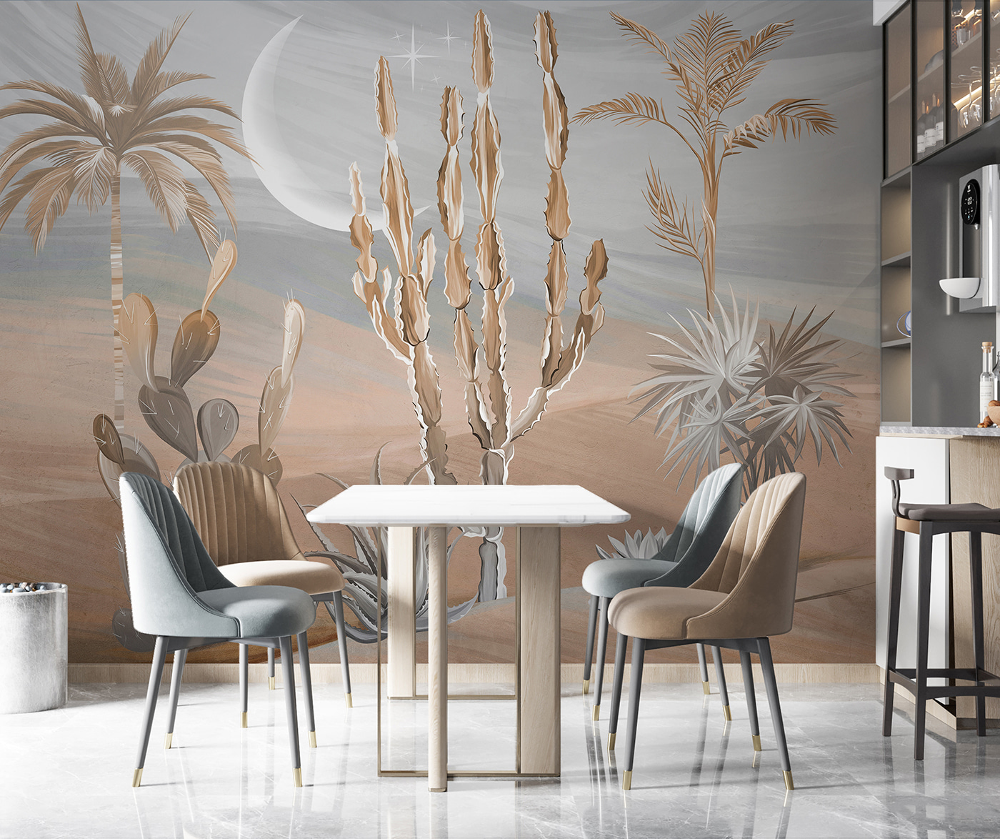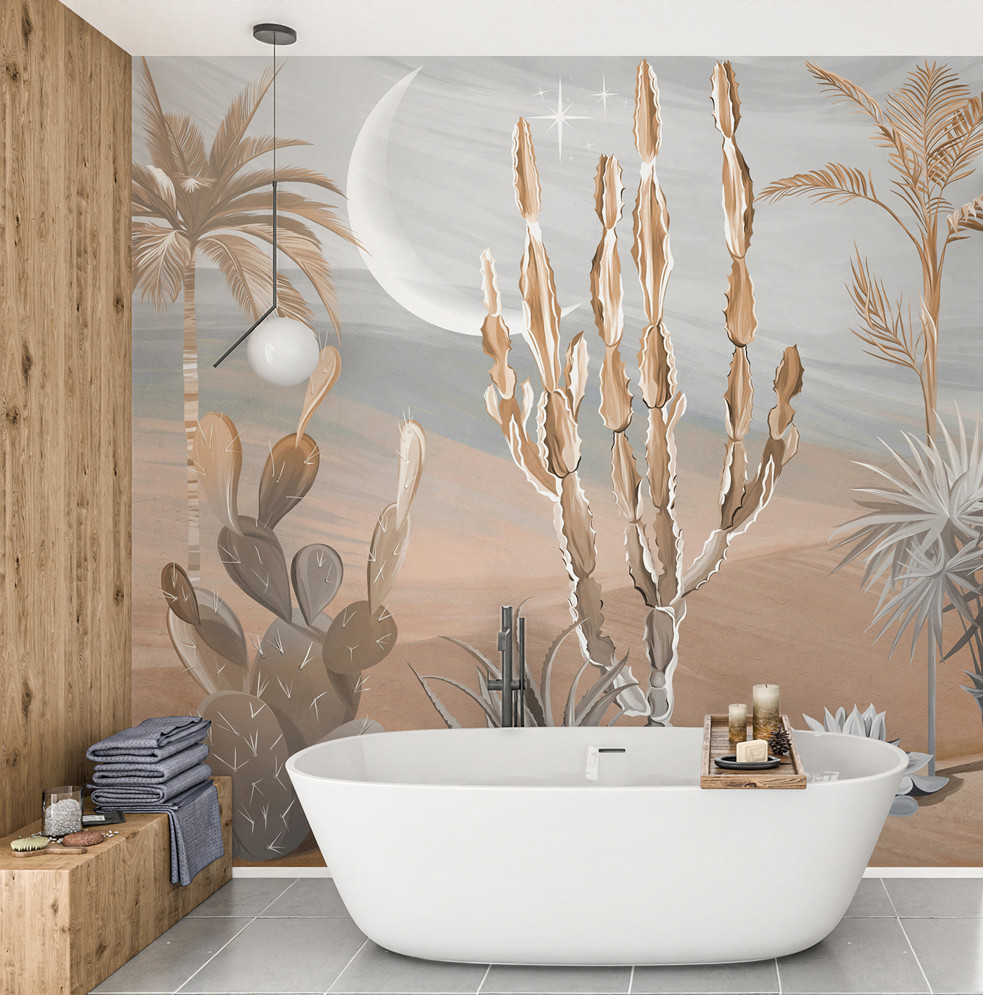 Transform any space with the “Desert Landscape with Cactuses and Palm Trees” mural. Imagine waking up to the calming vibes of a serene desert scene—those gentle hues whispering relaxation. Picture this beauty as a backdrop for your morning coffee or a cozy evening with friends. It’s like bringing a slice of the desert right into your home, minus the heat and sand in awkward places. Plus, those cacti? They’ve got character! They might even inspire daydreams about desert adventures. Perfect for nature lovers or anyone wanting to add a bit of warmth.