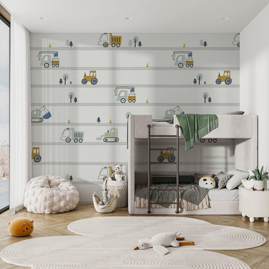 Brighten up a kiddo’s space (or your own!) with this whimsical wall mural featuring a lively yellow tractor with bold black wheels. It’s like having a cheerful construction site right on your wall! Picture this: a cozy room filled with dreams of adventure, where little ones play surrounded by charming trucks and trees, sparking their imaginations. The friendly colors and playful design make it perfect for any playful nook or nursery. A gentle reminder of fun days spent outdoors, this mural adds a touch of charm and creativity to the everyday routine. Who wouldn’t want to kick back and enjoy the built-in joy of a mini landscape right in their home?