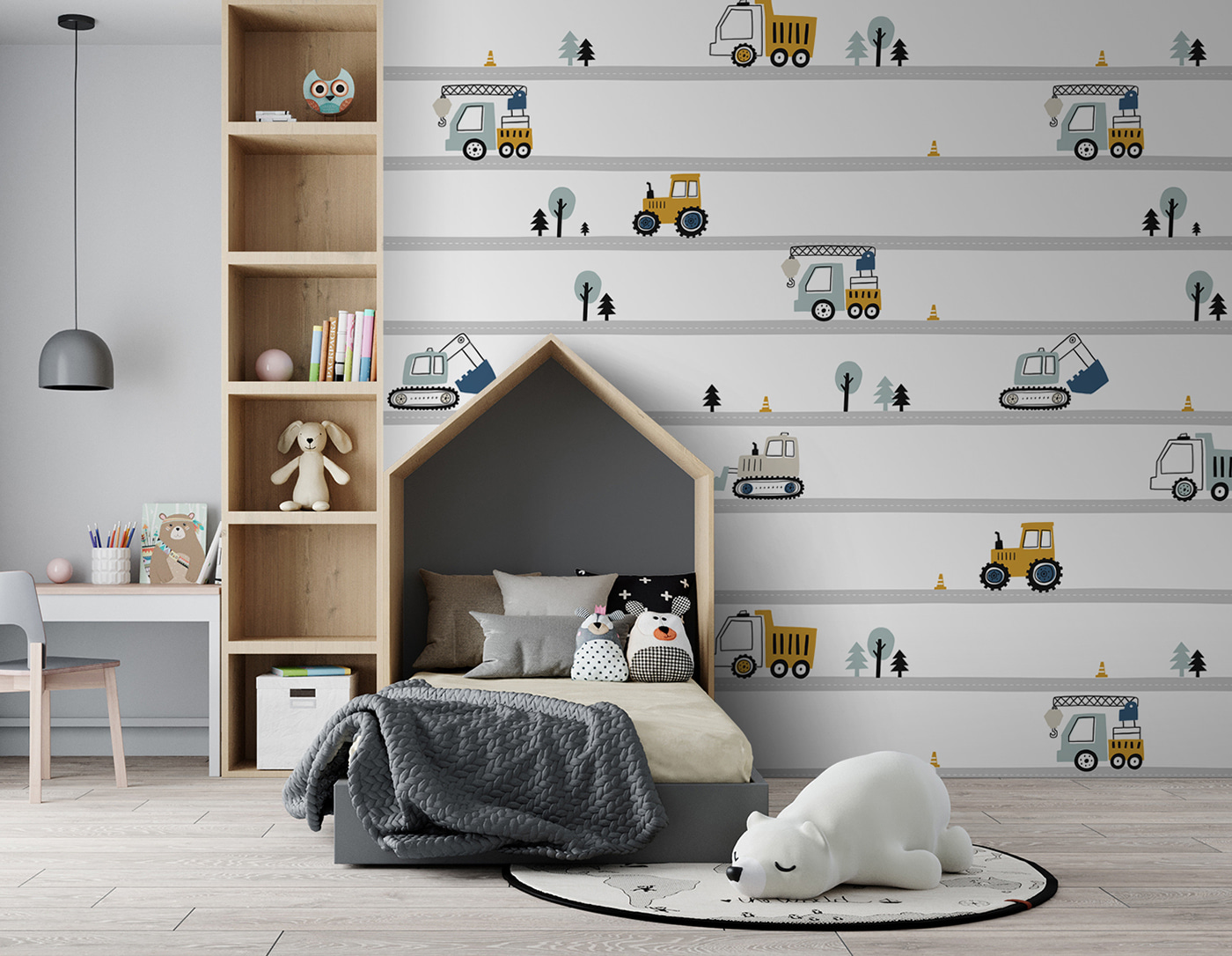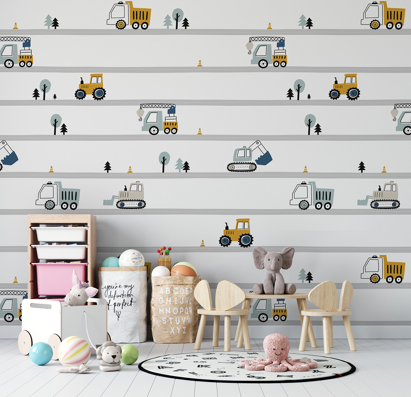 Brighten up a kiddo’s space (or your own!) with this whimsical wall mural featuring a lively yellow tractor with bold black wheels. It’s like having a cheerful construction site right on your wall! Picture this: a cozy room filled with dreams of adventure, where little ones play surrounded by charming trucks and trees, sparking their imaginations. The friendly colors and playful design make it perfect for any playful nook or nursery. A gentle reminder of fun days spent outdoors, this mural adds a touch of charm and creativity to the everyday routine. Who wouldn’t want to kick back and enjoy the built-in joy of a mini landscape right in their home?