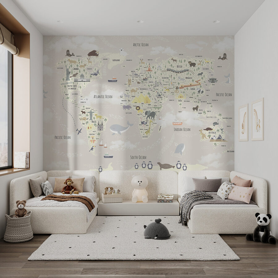 Transform any room into an adventurous wonderland with this charming map mural of the world. Imagine little explorers gazing at the playful animals and landmarks spanning every continent. It’s a perfect conversation starter during family game nights, inspiring dreams of far-off places while keeping that touch of whimsy alive. The soft colors make it feel like a cozy storybook, inviting creativity and curiosity. Whether it’s for a child’s room or a playful touch in a living area, this mural’s more than just decor—it’s a gateway to worlds unknown and tales waiting to be told. Adventures await!