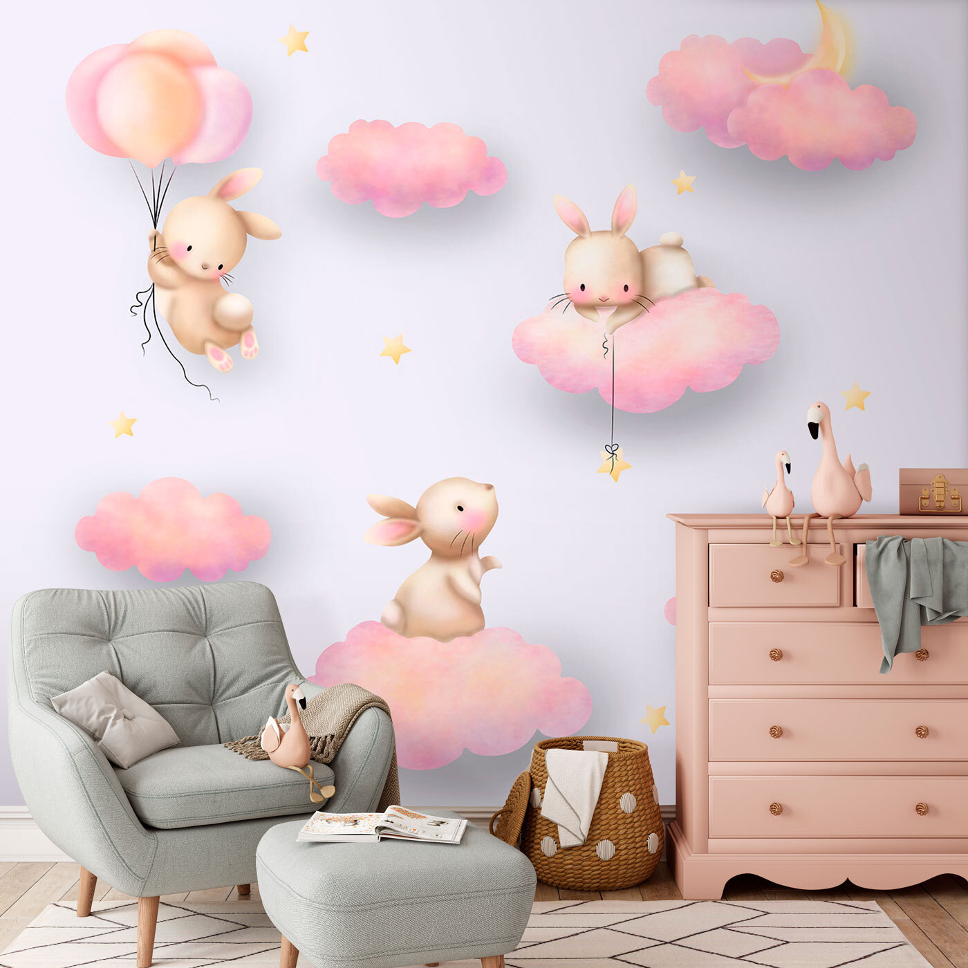 Transform any room into a whimsical wonderland with this lovely mural featuring charming bunnies floating on fluffy clouds. Picture this: a sunny afternoon, laughter echoing through the halls, and there’s a cute bunny holding a balloon, as if it’s on its way to a fantastic adventure. The soft pastel colors invite warmth and joy, making it perfect for nurseries or playrooms. It’s like a hug from childhood, bringing back those carefree days. Who wouldn’t want to start every day surrounded by such delightful company? Time to let creativity hop into your home!