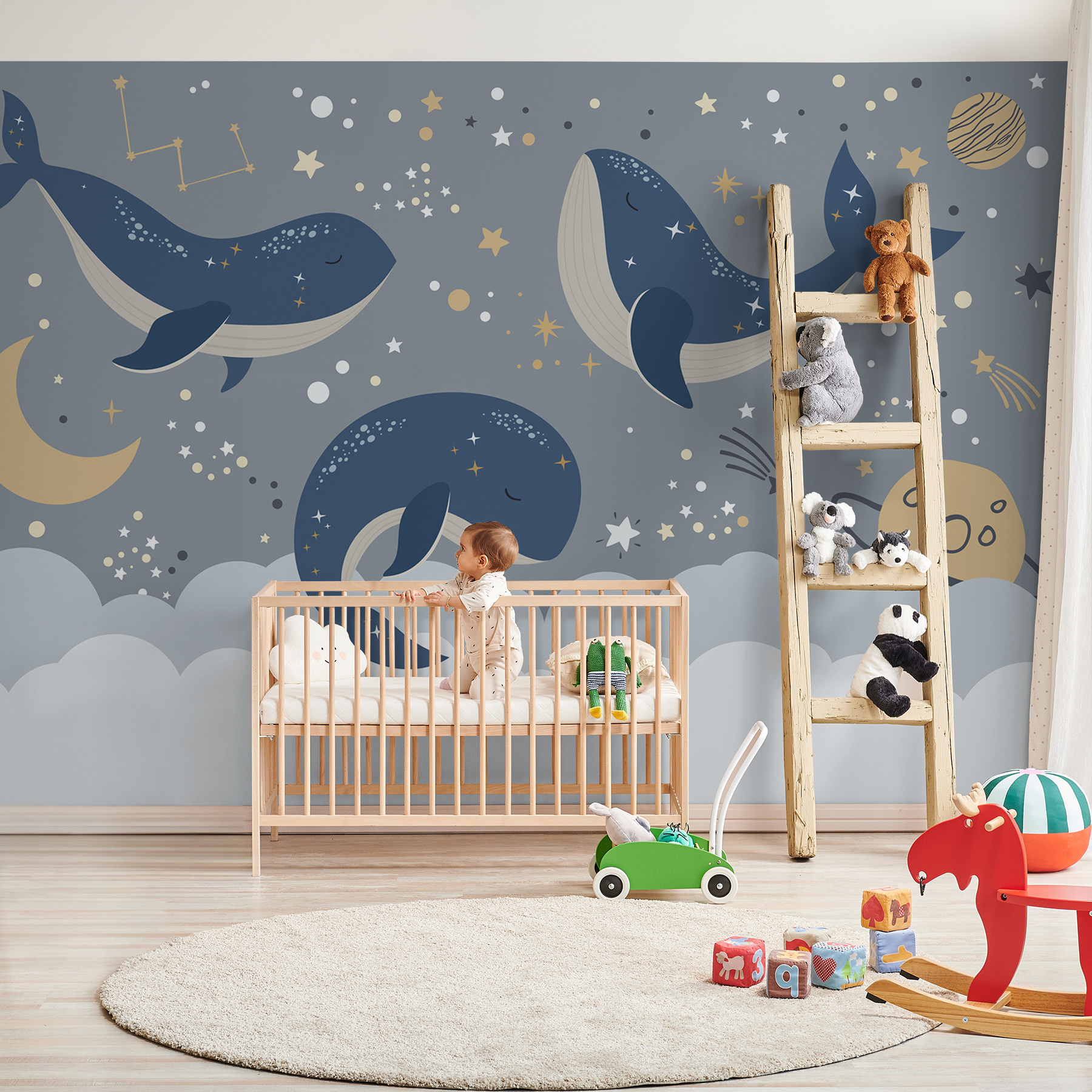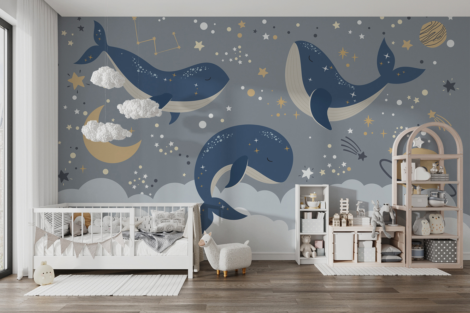 Transform any space with the enchanting “Blue Whale with White Tail and Stars” mural. Picture this: you’re lounging in your living room, and out of the corner of your eye, these whimsical whales are diving through a dreamy starry sky. It’s like having a slice of ocean magic right on your wall! The soft colors and playful stars create a serene atmosphere, making it perfect for cozy nights or even a child’s room. Imagine bedtime stories under the gaze of these gentle giants. It’s charming, a little dreamy, and definitely a conversation starter. Who wouldn’t want to dive into this delightful decor?