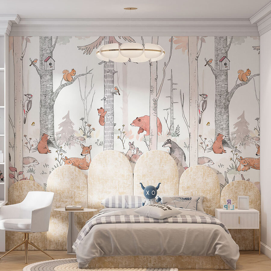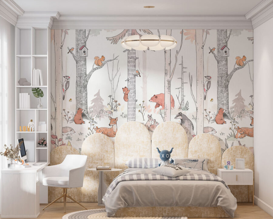 Transform any room into a charming woodland getaway with this delightful wall mural featuring a whimsical group of forest animals. Imagine deer lounging beneath the trees, playful squirrels scampering up branches, and a curious bear wandering by. It’s like having a secret forest in your own space! The soft colors and gentle illustrations invite a cozy, serene vibe—perfect for a nursery, playroom, or even a reading nook. Just picture the smiles it’ll bring to kids and adults alike, sparking tales of adventure and exploration. Anyone walking by might just stop and daydream about a day in the woods—bears included!