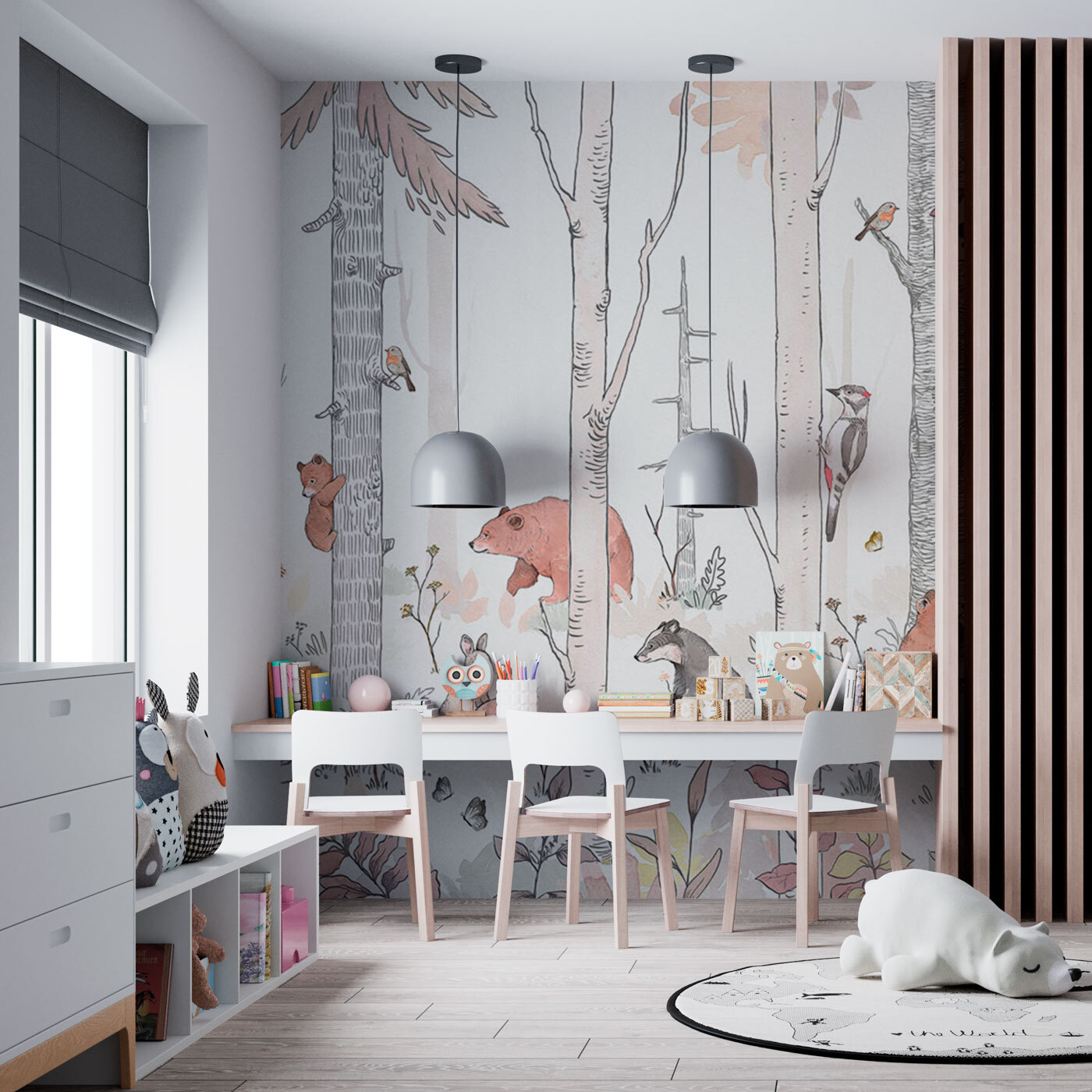 Transform any room into a charming woodland getaway with this delightful wall mural featuring a whimsical group of forest animals. Imagine deer lounging beneath the trees, playful squirrels scampering up branches, and a curious bear wandering by. It’s like having a secret forest in your own space! The soft colors and gentle illustrations invite a cozy, serene vibe—perfect for a nursery, playroom, or even a reading nook. Just picture the smiles it’ll bring to kids and adults alike, sparking tales of adventure and exploration. Anyone walking by might just stop and daydream about a day in the woods—bears included!