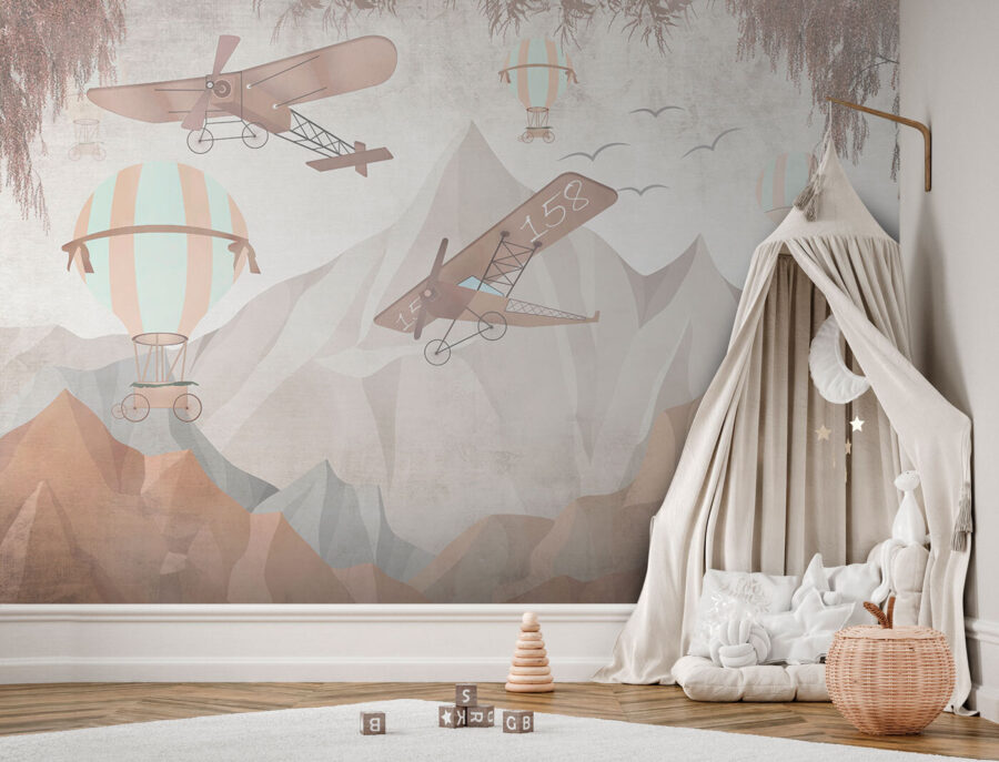 Transform your space into a whimsical escape with this enchanting wall mural featuring charming hot air balloons soaring above majestic mountains. It’s like bringing a slice of adventure right into your home—kind of like a weekend getaway without the packing hassle! The soft, muted colors create a soothing vibe, making it perfect for a cozy reading nook or a playful kid’s room. Imagine settling in with a cup of tea, surrounded by this serene backdrop, daydreaming about your next big adventure. A mural like this doesn’t just decorate; it invites stories, laughter, and the occasional imaginary flight. What could be better?