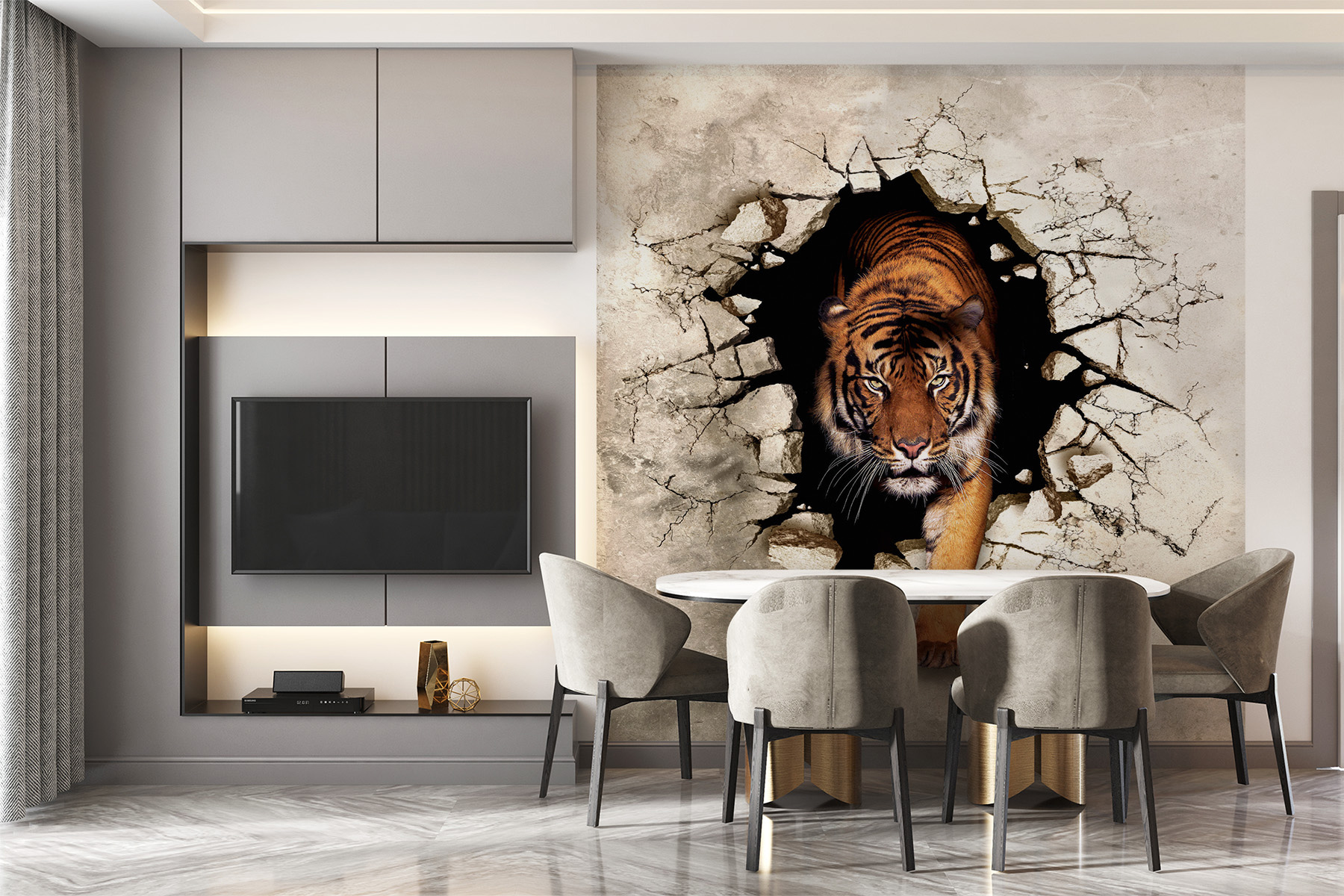 Transform your space into a wild adventure with this striking mural of a tiger emerging through a cracked wall. It’s not just a piece of art; it’s a conversation starter! Imagine walking into the room and feeling the bold energy of nature right at your fingertips. The lifelike tiger, with its intense gaze and dynamic pose, brings a certain thrill—like you might need a safari hat just to be safe.