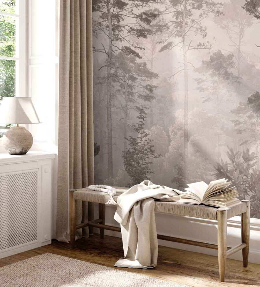 Transform your space into a serene escape with the “Misty Forest with Tall Trees” mural. Imagine stepping into a tranquil woodland, where soft, foggy greens and silvery tones wrap around you like a gentle hug. It’s perfect for creating that calm vibe in a living room or a cozy reading nook. Picture a lazy afternoon, a cup of tea in hand, surrounded by the whisper of trees swaying in a soft breeze. And hey, if a squirrel or two decides to join the scene—who could complain? This mural’s dreamy aura invites relaxation and daydreaming, making every glance feel like a mini-getaway.