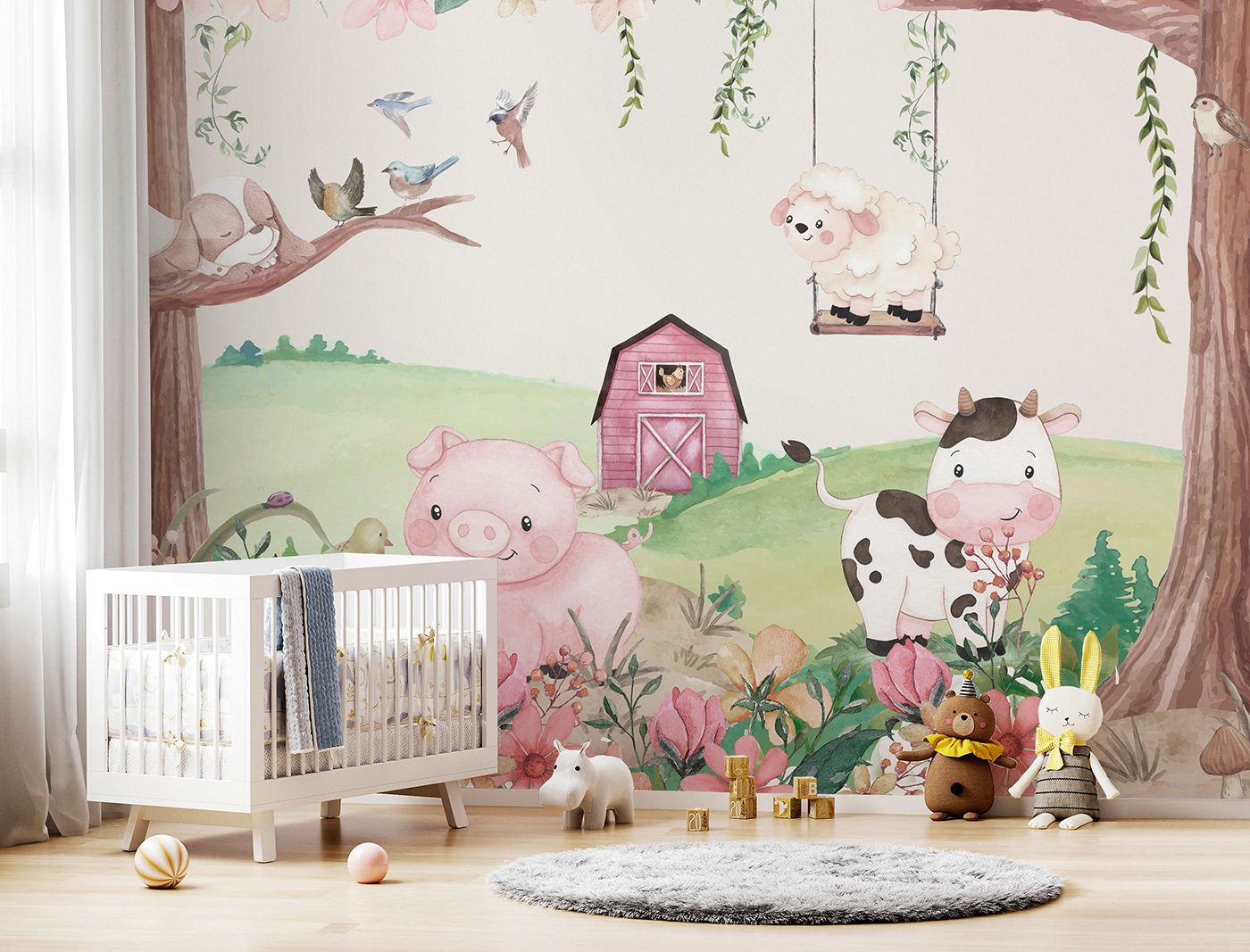 Transform your space into a storybook scene with this whimsical wall mural featuring a charming pink barn, a playful chicken peeking out the window, and an adorable cast of farm friends. Picture sunny days, gentle breezes, and laughter echoing as guests stroll by. The soft pastel colors bring a cozy vibe that makes everything feel just a bit brighter. Imagine curling up in a room adorned with this mural—maybe with a cup of tea, watching the morning light dance on those cheerful flowers. It’s like having a little slice of country life right at home, charming enough to bring smiles to every visitor. Perfect for a nursery, playroom, or any space in need of a joyful touch!
