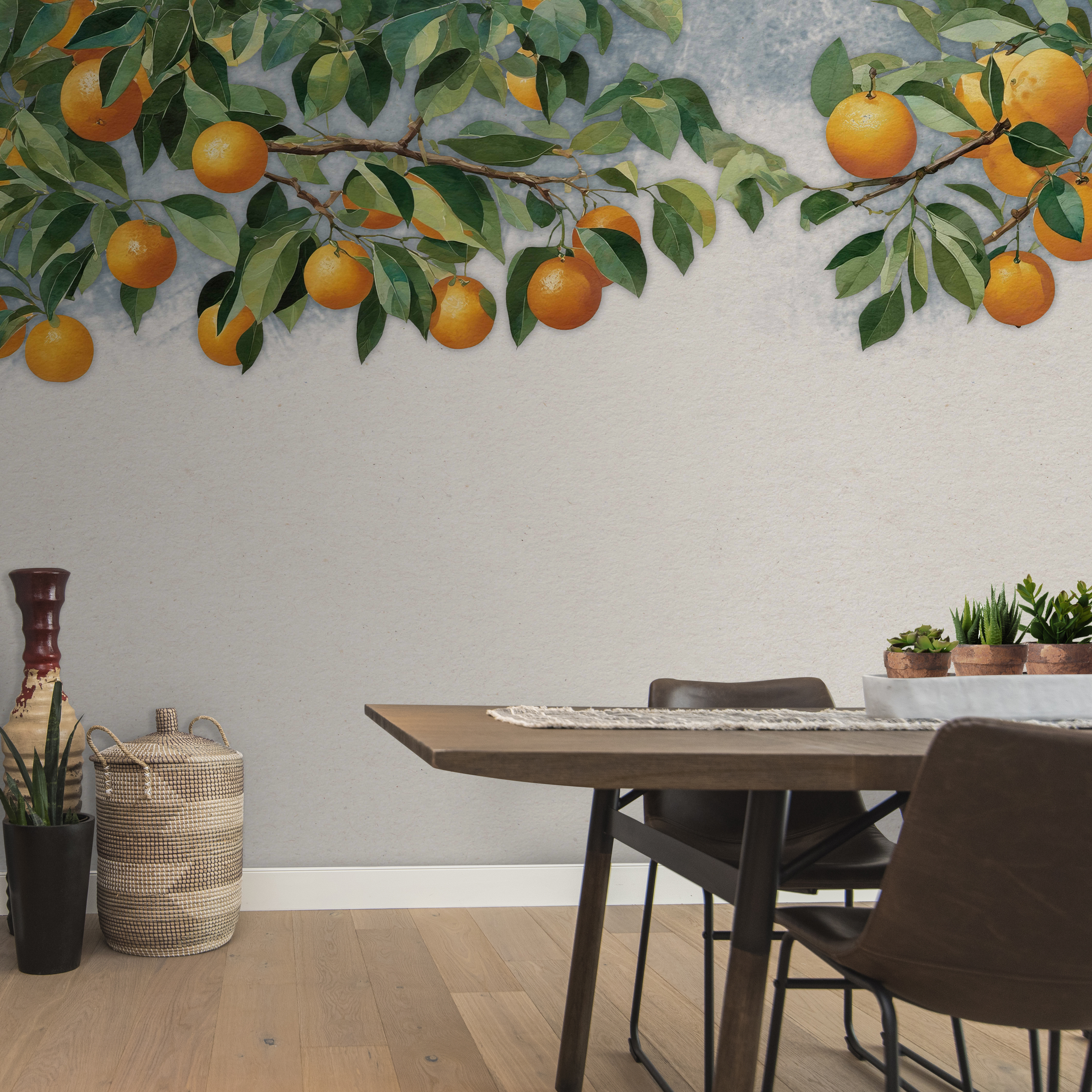 Transform any space with this delightful mural featuring vibrant oranges nestled among lush green leaves. It’s like bringing a sunny orchard right into your living room—without the mess of actual fruit, of course! Imagine waking up to this cheerful scene, where every glance feels like a mini vacation. Whether it’s the kitchen, a cozy nook, or even a vibrant playroom, this mural brings life and warmth, sparking smiles and maybe a craving for a juicy snack. It’s perfect for those who love a pop of color that feels fresh yet grounded. Hang it up and let the good vibes roll in!