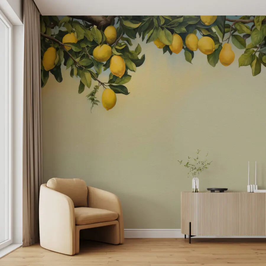 Brighten up any room with this charming mural featuring lemons dangling from leafy branches. It’s like bringing a slice of sunny orchard right to your walls. Imagine walking into your space and immediately feeling a spark of freshness—almost like a warm summer day. The vibrant yellows? They’ll lift your spirits, making even Mondays feel a bit more cheerful. Perfect for a kitchen or dining area, it invites conversations and maybe even those spontaneous moments of sharing lemonade. Get lost in its warm hues—who knows, maybe it’ll inspire some zesty recipes too!