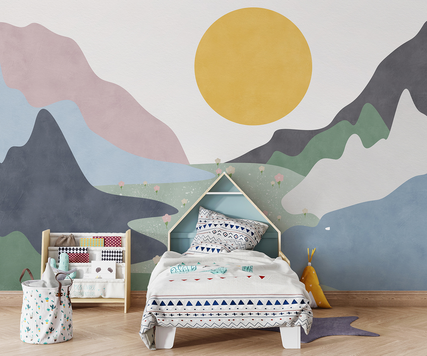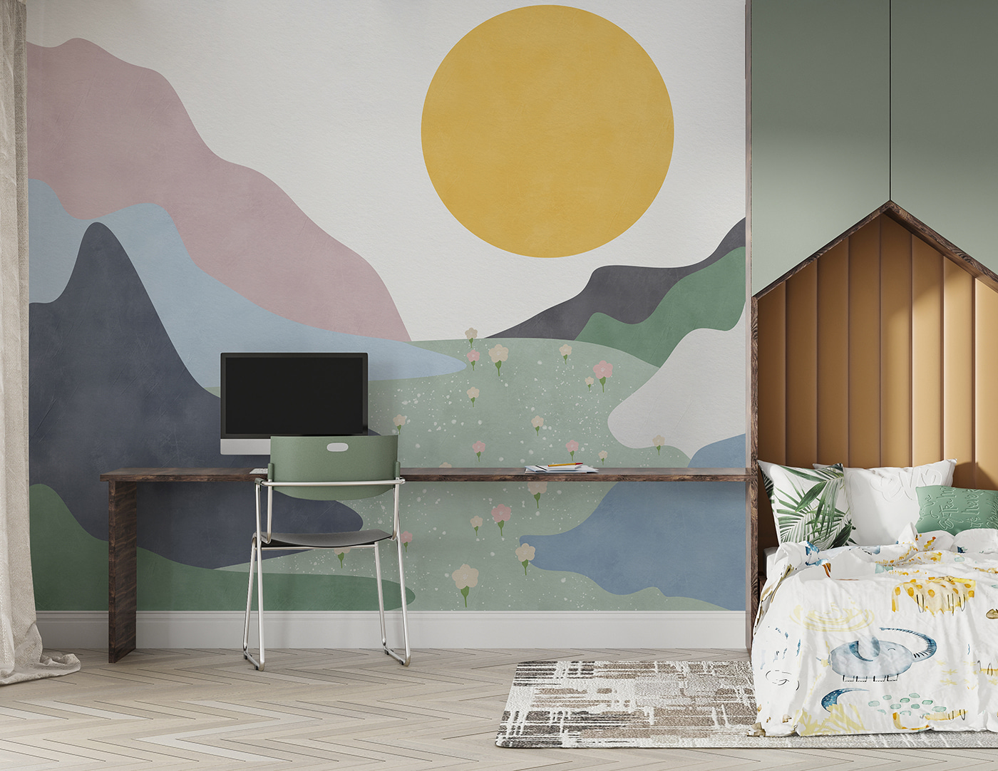 Transform any room into a playful wonderland with this cheerful wall mural! Picture a bright yellow circle—yes, that’s the sun—lighting up a dreamy landscape of soft, pastel mountains. Each curve flows like a gentle breeze, inviting daydreams and exploration. Imagine little ones gazing at it, their imaginations sparked by the colorful blooms dotting the hills. It’s the perfect backdrop for bedtime stories or dance parties in the living room! This mural doesn’t just brighten walls; it adds a splash of joy and warmth that makes any space feel just a bit more special. Who wouldn’t want a sunny retreat like this?