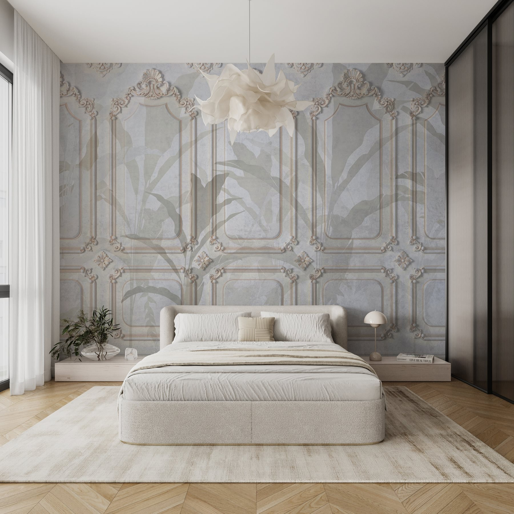 Transform your space with this stunning wall mural featuring ornate white and brown designs. It’s like bringing a piece of dreamy elegance right into your home. Picture this: you’ve just finished a long day, and you walk into a room that feels like a cozy art gallery. The intricate patterns dance softly on the wall, making even your sofa feel a little fancier, right?
