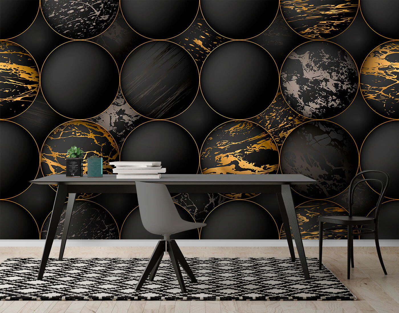 Transform a dull space into something extraordinary with this wall mural featuring black spheres and intriguing marbling patterns. It’s like stepping into a cosmic realm without leaving your living room. Each sphere seems to play a game of hide and seek, creating a visual dance that invites curiosity. Imagine hosting friends, and their eyes widening in awe at this striking backdrop. It’s perfect for a cozy den or a chic office, sparking conversation and creativity. Let this mural create a vibe that’s both modern and mysterious—because who doesn’t want a little drama on their walls?