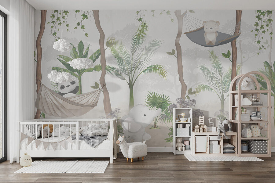 Imagine stepping into a lush jungle where even the animals know how to chill. This enchanting wall mural brings a playful scene to life, featuring a cute bear lounging lazily in a hammock between treetops. Surrounded by a panda, elephant, and a whimsically patterned giraffe, it’s like a jungle party where everyone’s invited! Picture this in a child’s room or a cozy reading nook—instant smiles guaranteed. The soft colors and gentle vibes create a calming atmosphere, making it perfect for unwinding after a long day. And honestly, who wouldn’t want to escape to this dreamy oasis every now and then? Transform your space into a playful paradise and let the adventures begin!