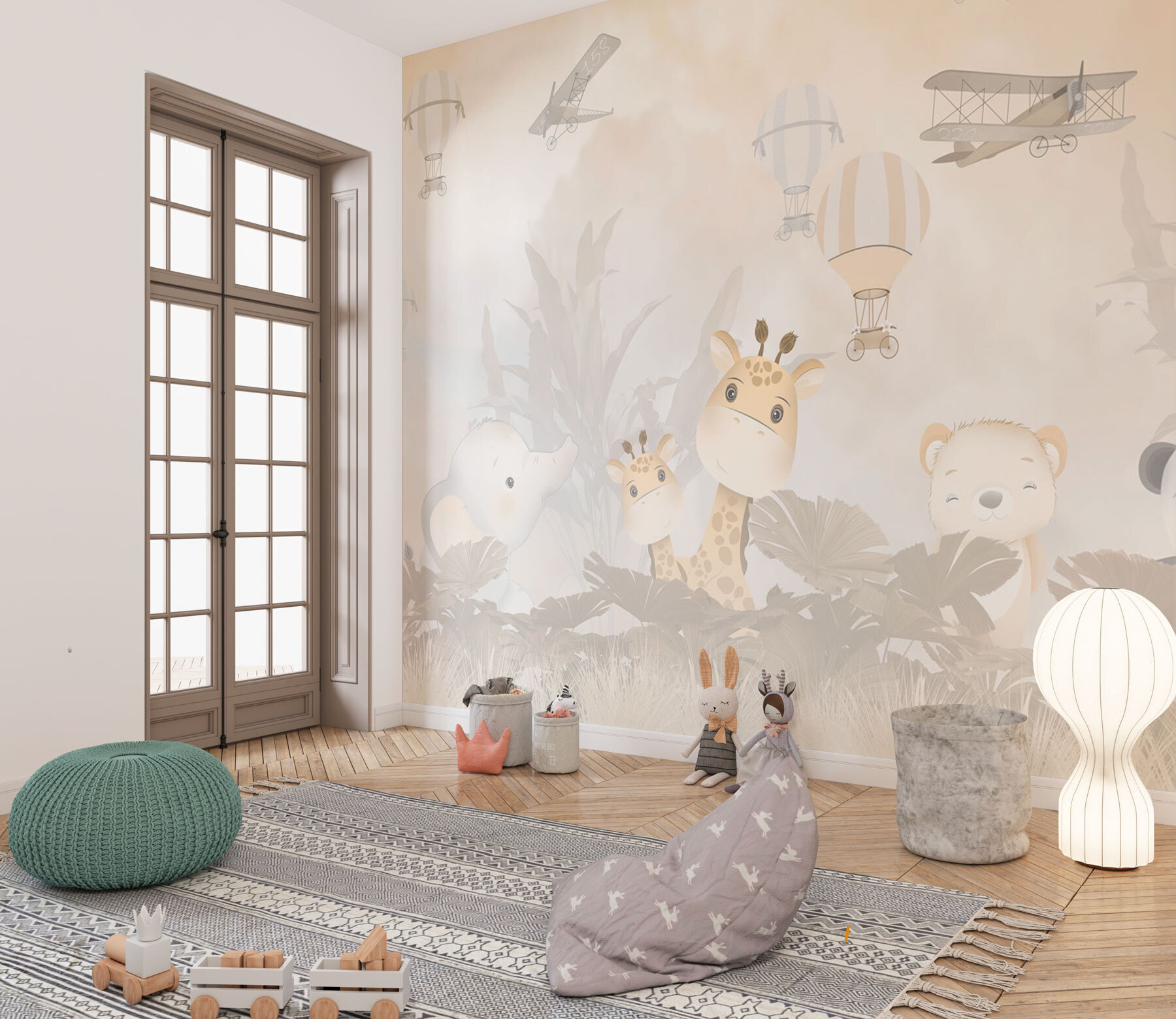 Picture this: a whimsical adventure right in your living space! This mural, “Wall Murals Hot Air Balloon in the Sky,” invites playful charm with adorable animals gazing up at vintage hot air balloons soaring overhead. It feels like stepping into a dream, where elephants and giraffes share moments of curiosity among lush greenery. Imagine sipping your morning coffee, grinning at these cheerful creatures. They stir up a sense of wonder, sparking conversations and smiles. Perfect for a child’s room or any spot that could use a sprinkle of joyful magic, it’s like a ticket to a happy place without the travel fuss. Who wouldn’t want a daily dose of adventure right on their walls?