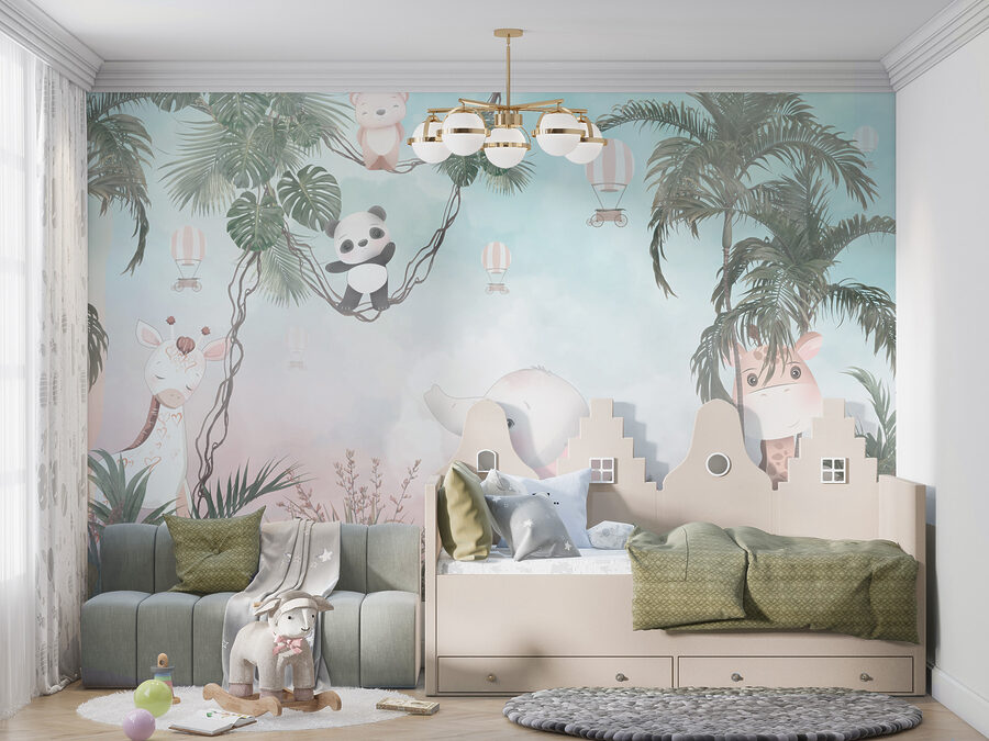 Transform a child’s room into a whimsical adventure with this delightful mural of a panda and friends. Imagine lazy afternoons as little ones gaze up at their new pals, an elephant with the sweetest smile and a giraffe peeking through the leaves. With a soft, dreamy color palette, it adds a cozy touch to any space, making it perfect for playtime or nap time. Picture storytime under this mural, where imagination runs wild and dreams take flight. It’s not just decor; it’s a charming little world that invites laughter and creativity. The perfect backdrop for memories yet to be made!