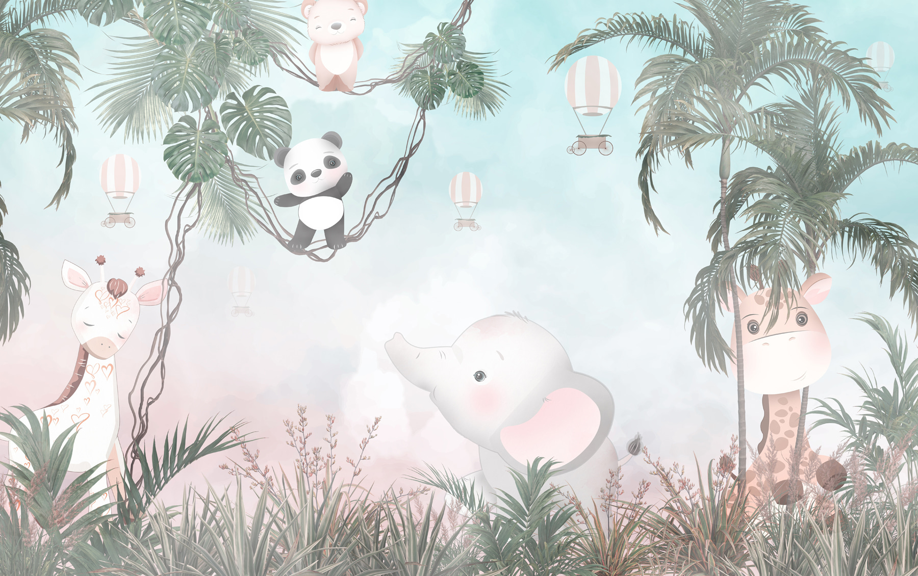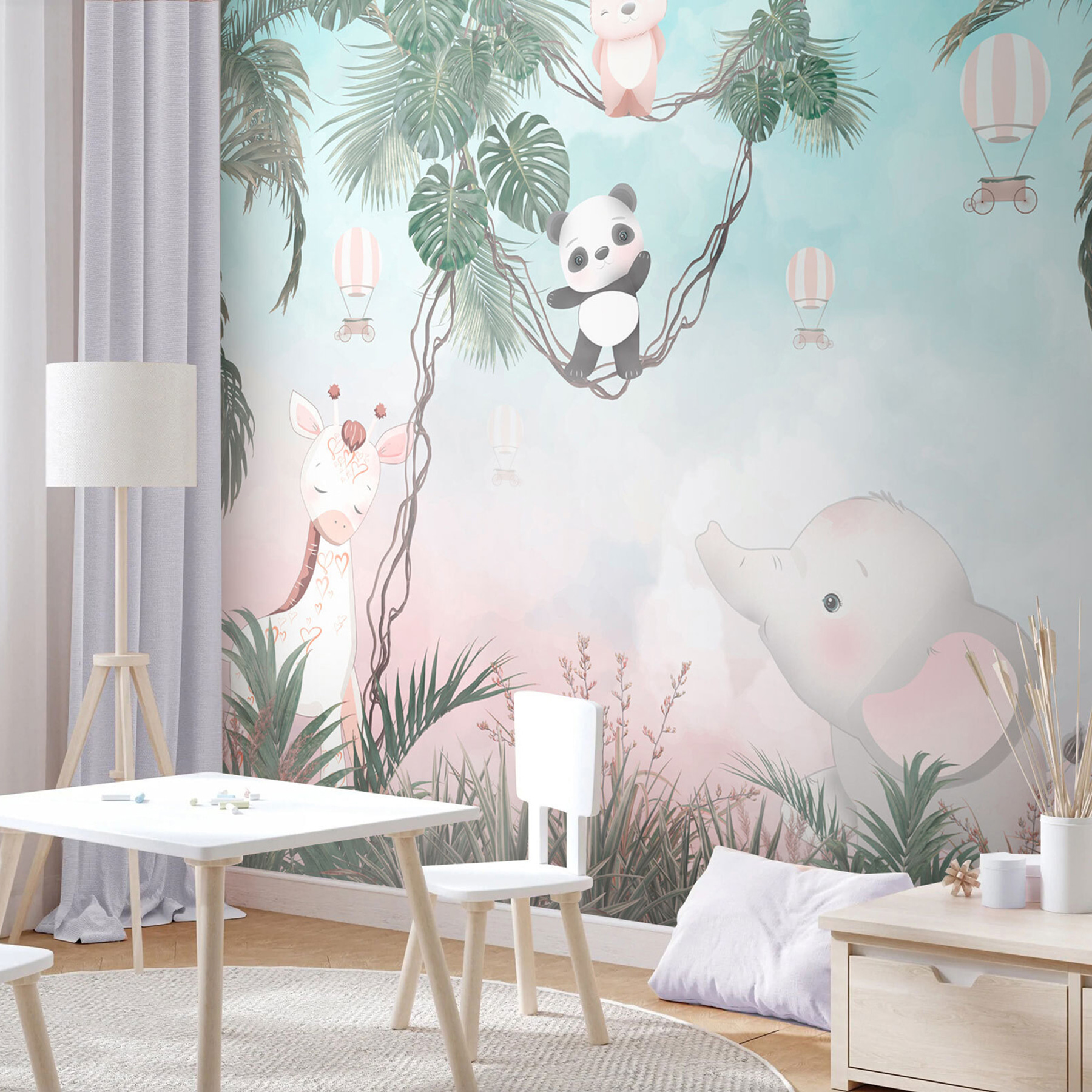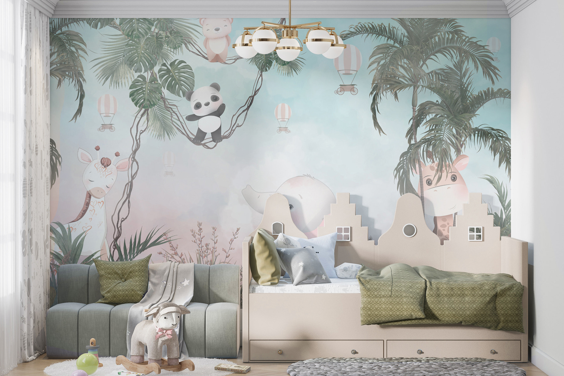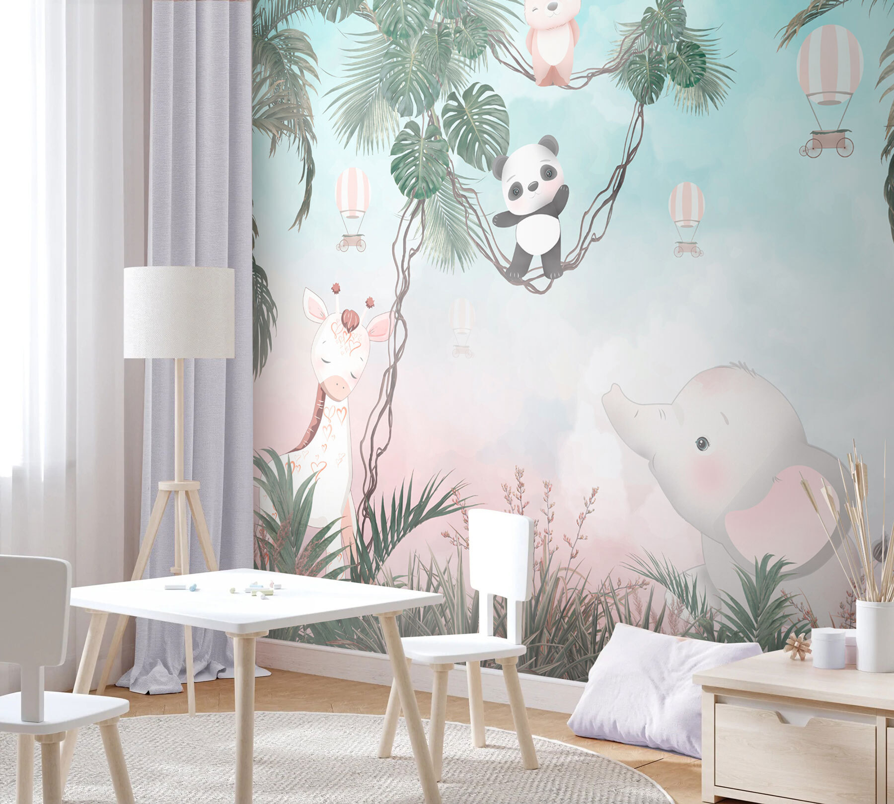 Transform a child’s room into a whimsical adventure with this delightful mural of a panda and friends. Imagine lazy afternoons as little ones gaze up at their new pals, an elephant with the sweetest smile and a giraffe peeking through the leaves. With a soft, dreamy color palette, it adds a cozy touch to any space, making it perfect for playtime or nap time. Picture storytime under this mural, where imagination runs wild and dreams take flight. It’s not just decor; it’s a charming little world that invites laughter and creativity. The perfect backdrop for memories yet to be made!