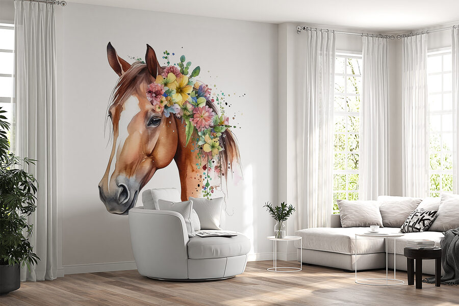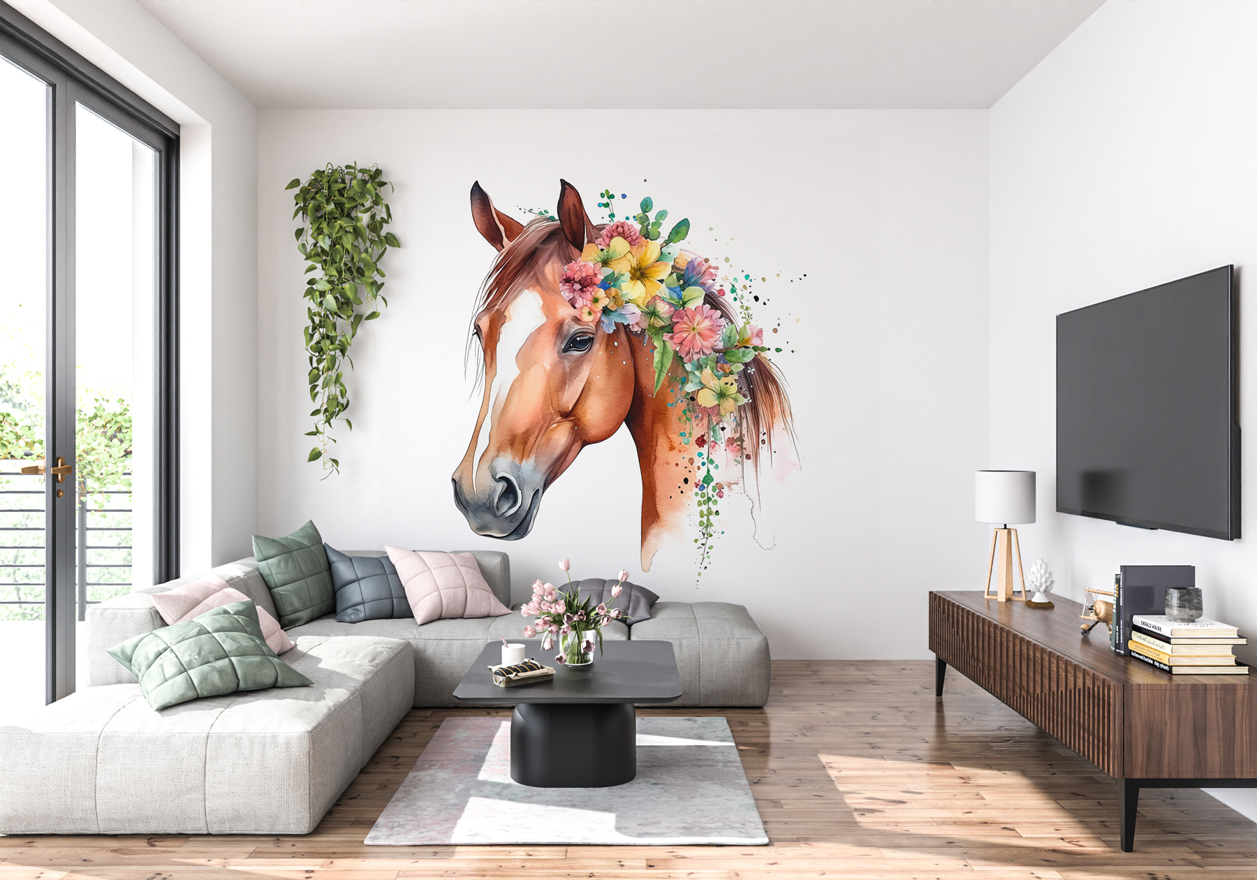 Bring a splash of whimsy and warmth into your space with this delightful mural featuring a horse adorned in a vibrant bouquet. It’s like your wall just got a stylish makeover—no need for a fancy event or even a good reason! Imagine sipping coffee and getting lost in those cheerful flowers every morning. It’s a conversation starter, too—friends will be drawn to it, probably asking if it’s your spirit animal. Plus, the colors? They dance together, brightening up even the gloomiest days. Perfect for a cozy nook or a lively living room, this mural invites smiles and daydreams—who wouldn’t want that?