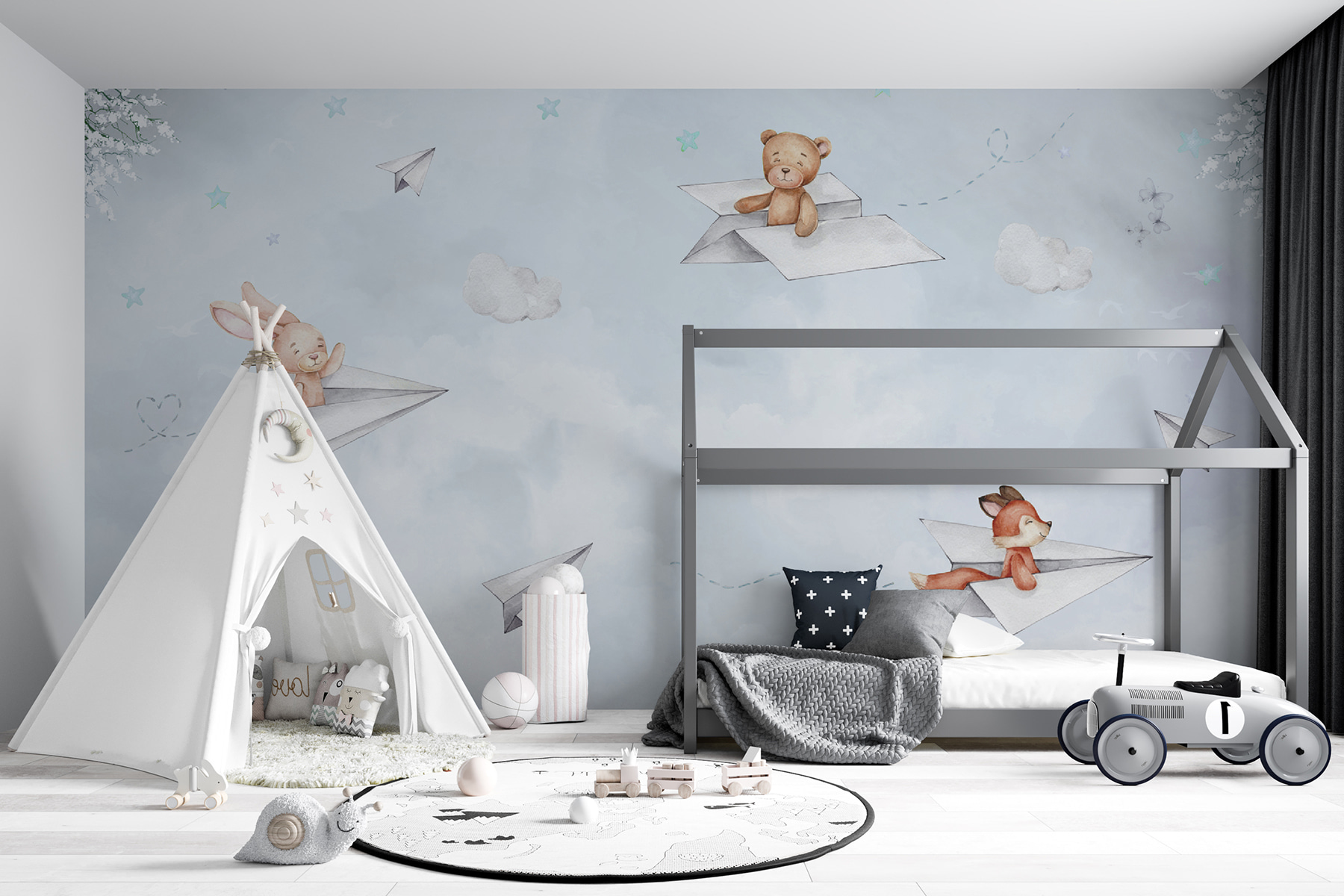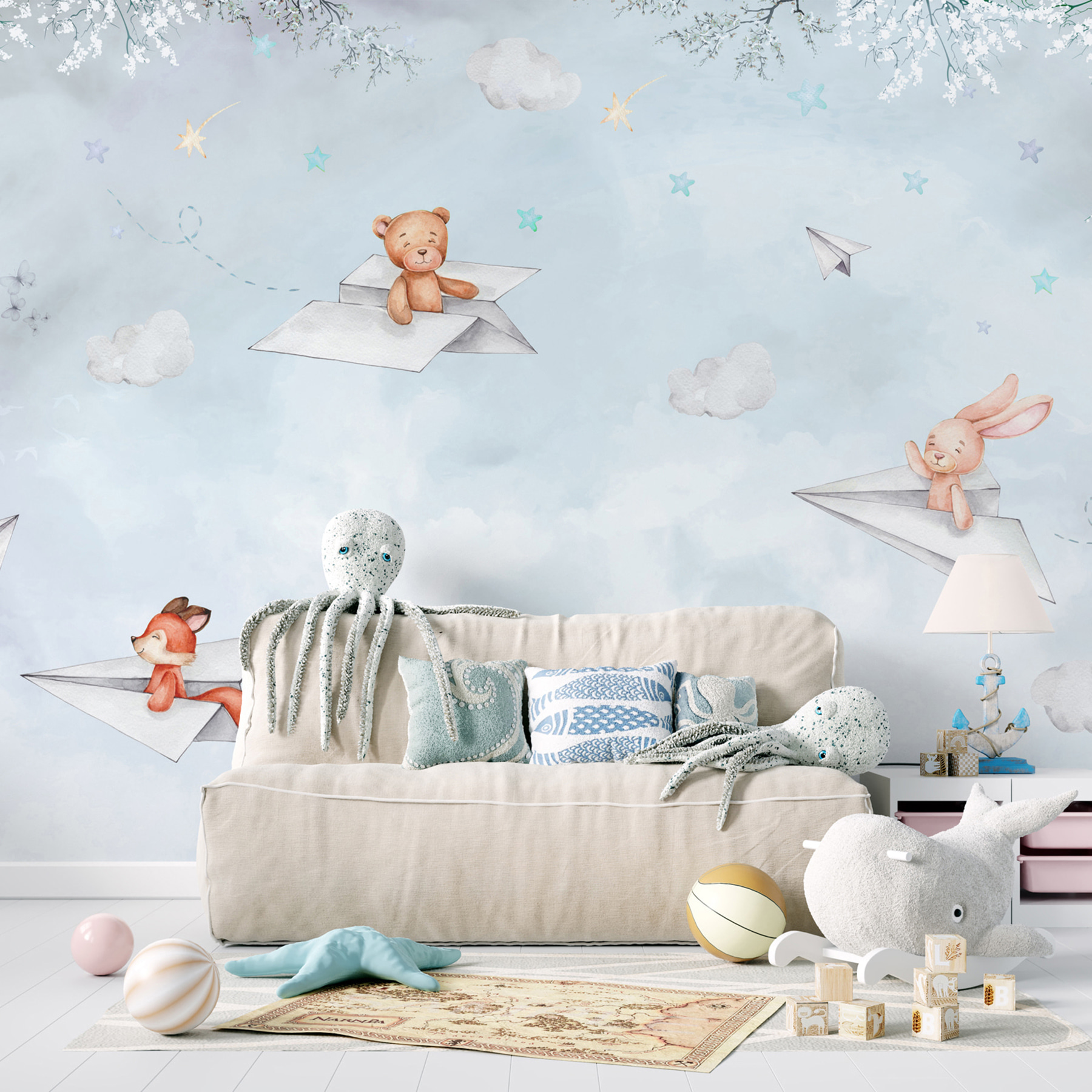 Brighten any space with this charming mural featuring whimsical animals floating on paper planes! Imagine a cozy corner transformed by a playful bear, a cheerful bunny, and a clever fox, all soaring through a dreamy sky filled with fluffy clouds and twinkling stars. It’s perfect for a nursery, playroom, or anywhere that could use a sprinkle of magic.