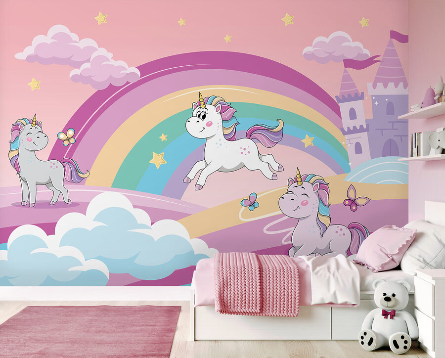 Transform any room into a whimsical wonderland with this enchanting unicorn wall mural. Featuring adorable unicorns prancing through fluffy clouds and vibrant rainbows, it sparks imagination and joy. Perfect for a child’s room or any space craving a splash of magic. Just picture those delighted giggles as little ones spot the playful butterflies flitting around. It’s like inviting a fairy tale into everyday life. Who wouldn’t want to wake up to this cheerful scene? Instant smiles are guaranteed, and it’s sure to inspire dreams of adventures. Perfect for a touch of whimsy, don’t you think?