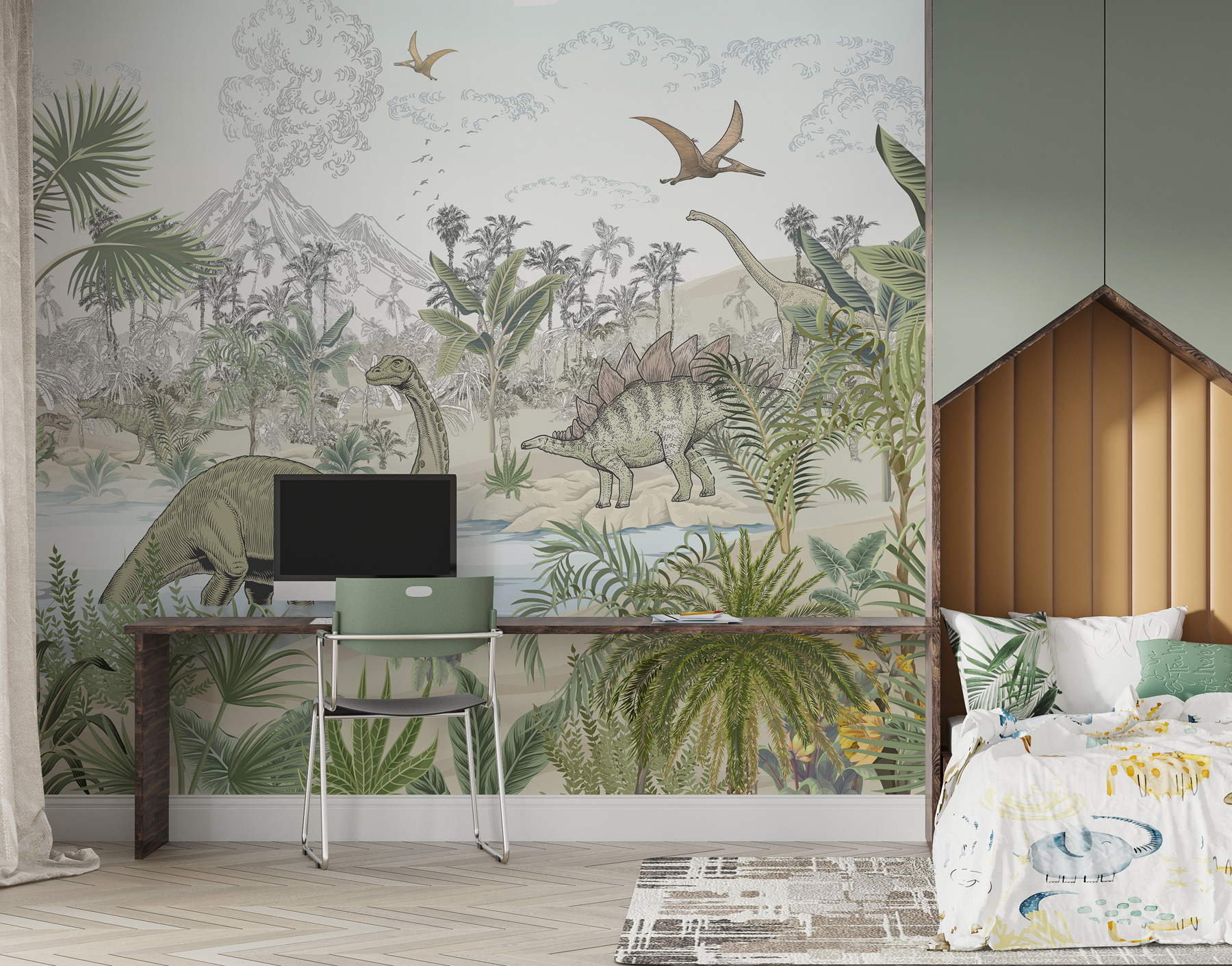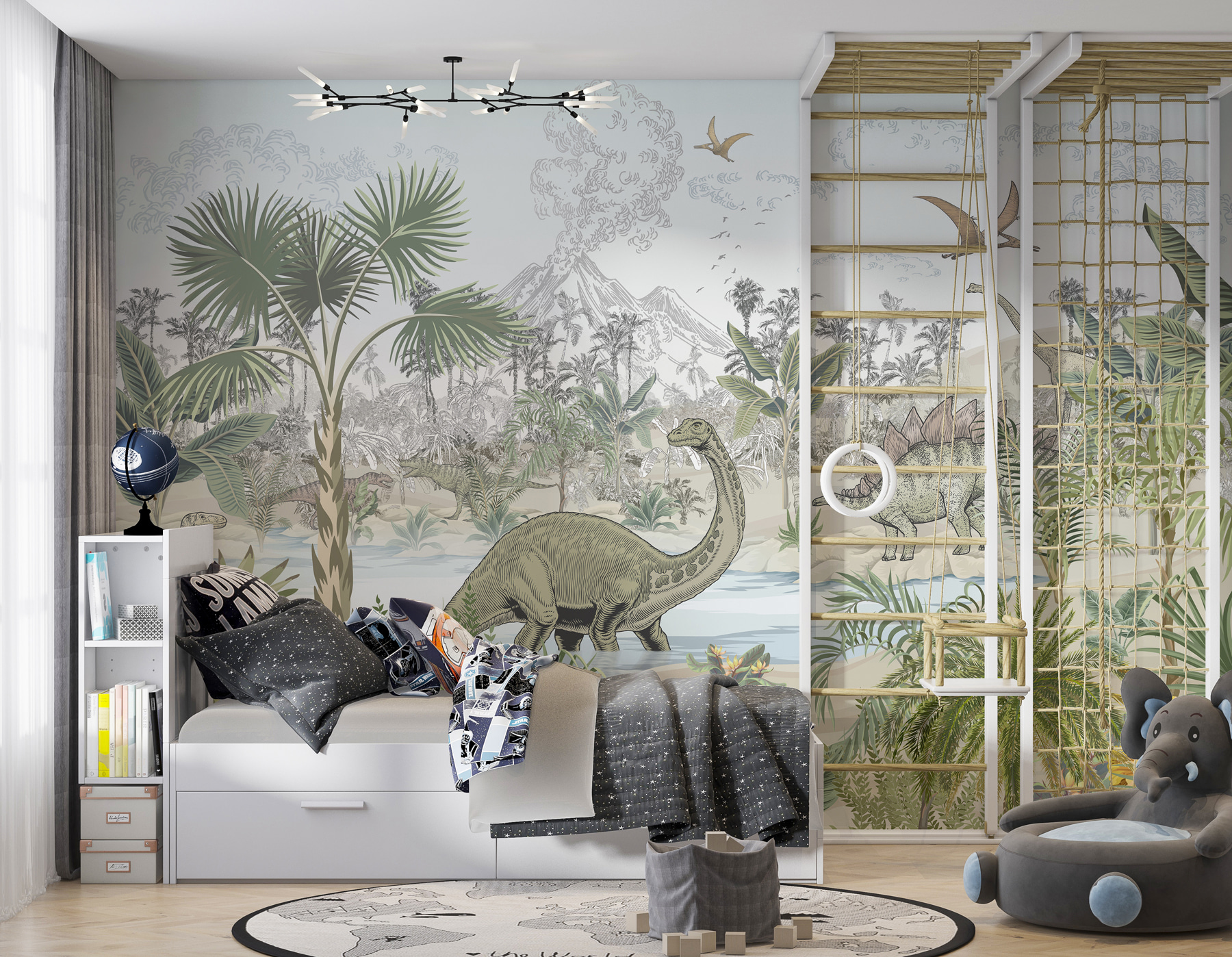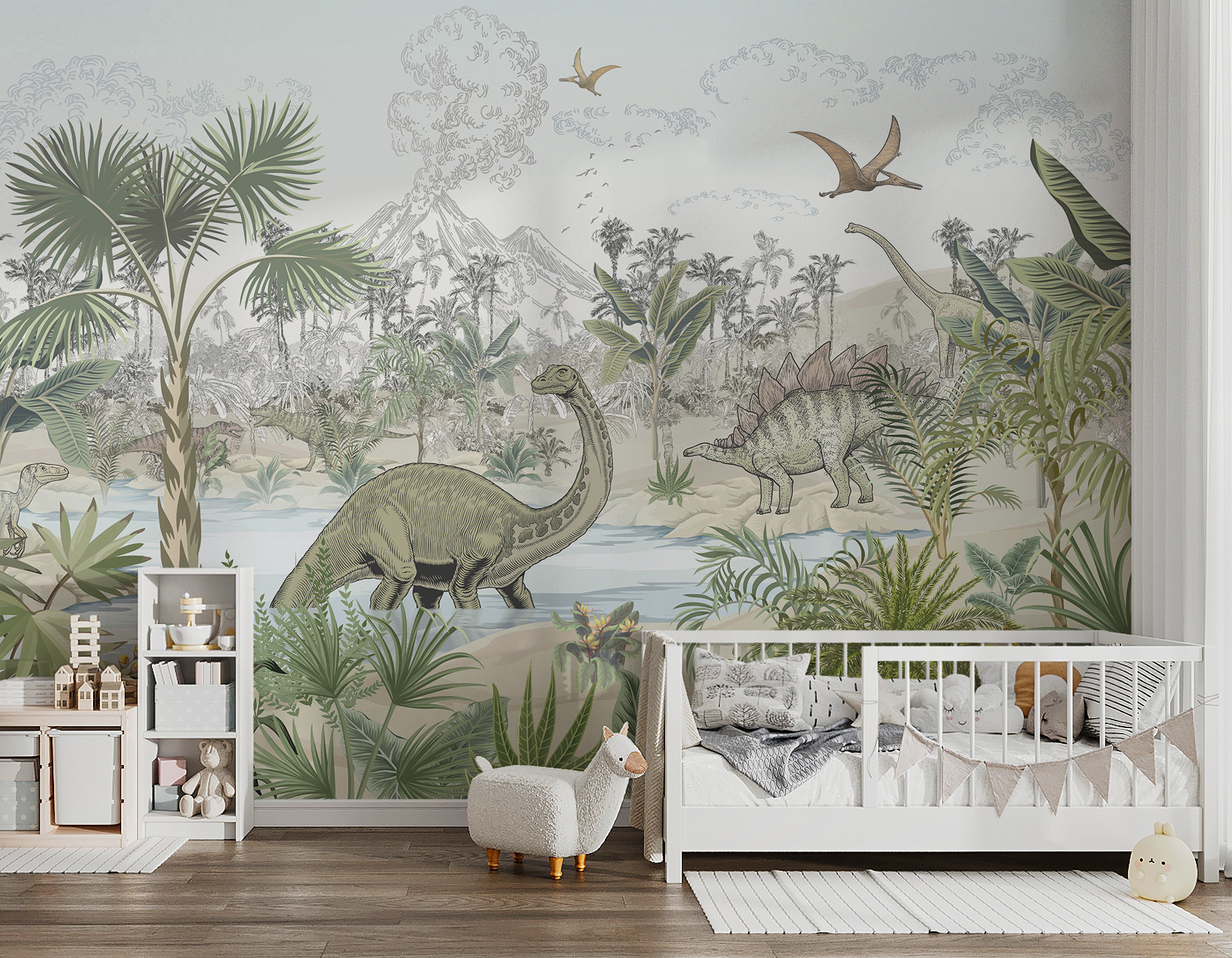 Transform any room into a prehistoric paradise with this stunning dinosaur mural. Imagine little ones stepping into a lush landscape filled with gentle giants, palm trees swaying, and birds soaring overhead. It’s like having a mini Jurassic adventure right at home. The detailed artwork brings these fascinating creatures back to life, making every day feel like a new expedition. Perfect for sparking curiosity, inspiring imagination, or simply adding some fun to your space. Plus, it’ll make for some epic storytime scenes—just picture the dino-themed tales that could unfold! Who wouldn’t want to wander amidst the dinosaurs? It’s bold, playful, and just a bit wild, capturing hearts and imaginations.