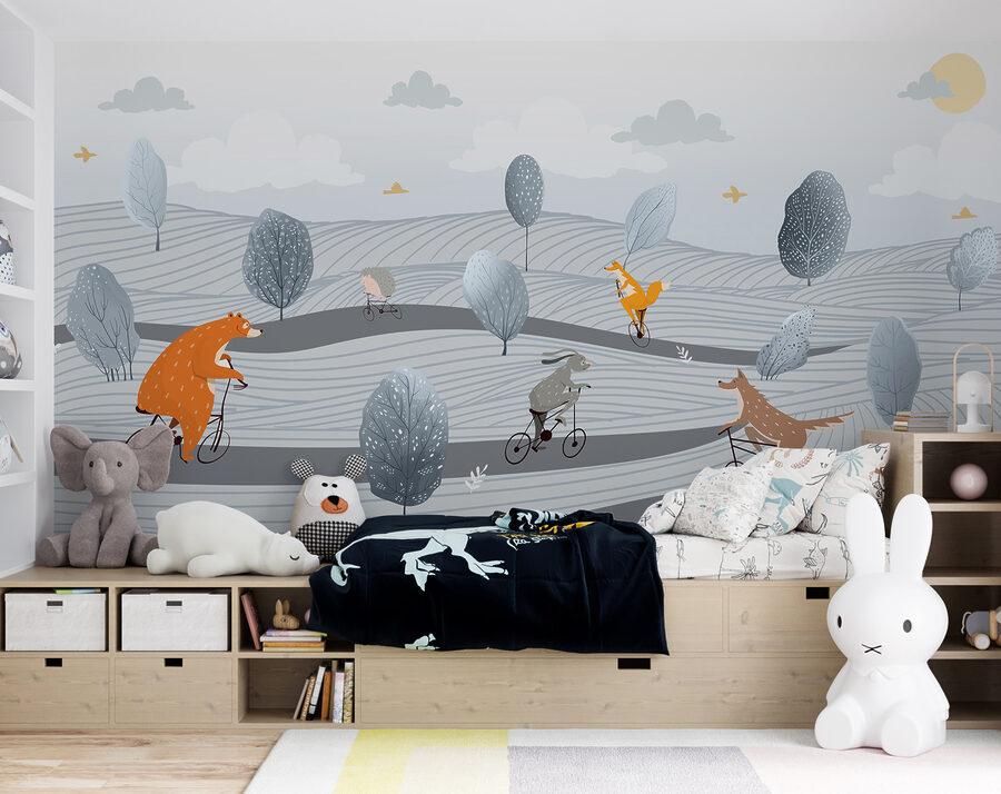 Brighten up a space with this playful mural featuring a dog riding a bicycle, surrounded by a charming animal parade. Imagine the cheerful vibes it brings—seriously, who wouldn’t smile at a bear cruising by? It’s like a whimsical storybook come to life, perfect for kids or anyone young at heart. The gentle colors create a cozy atmosphere, making rooms feel inviting. This mural can spark conversations, inspire giggles, and add a touch of adventure to everyday life. It’s just the kind of splash of fun that transforms walls from plain to a delightful backdrop where imagination knows no bounds.