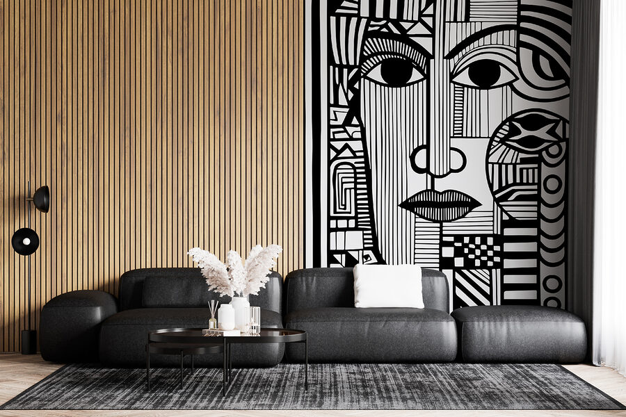 Step into a world of bold expression with this stunning black and white mural, featuring a captivating face drawn with unique lines and patterns. It’s like having a cool art gallery right in your living room—no overpriced entry fees here! Imagine sipping coffee while you admire the intricacies of this piece, letting your mind wander through its geometric maze. Whether it’s adorning a cozy reading nook or making a statement in a hallway, this mural brings flair and a dash of mystery. Friends will definitely ask about it, and you can pretend you have a secret artist connection. Perfect for jazzing up any space, this mural feels modern yet timeless!