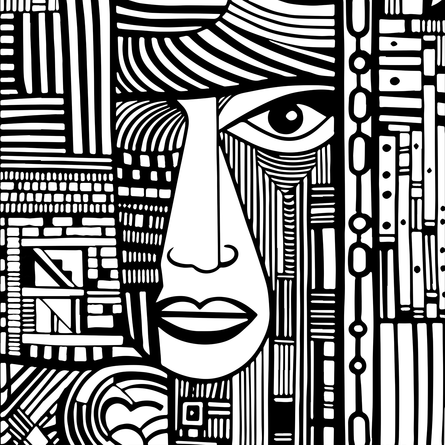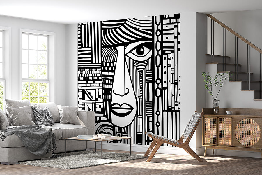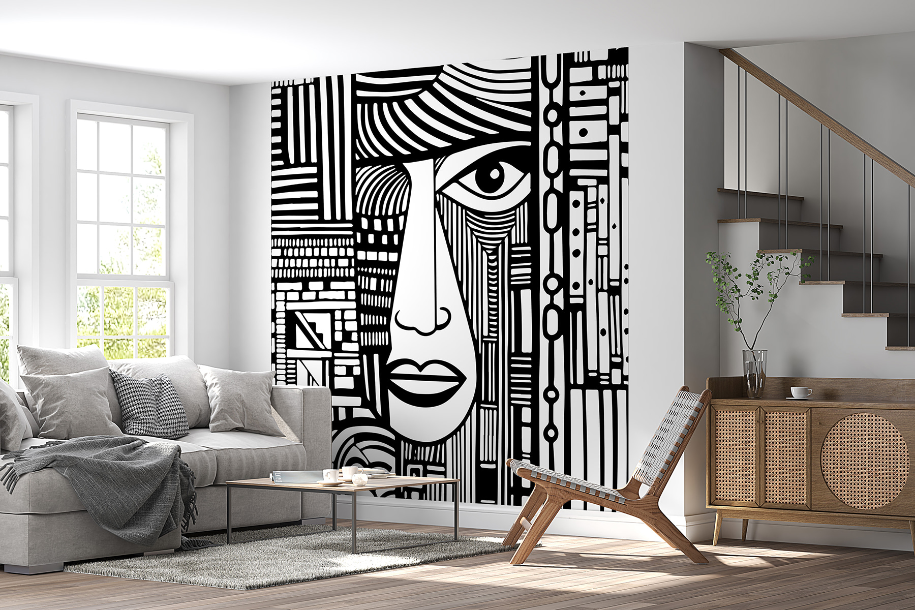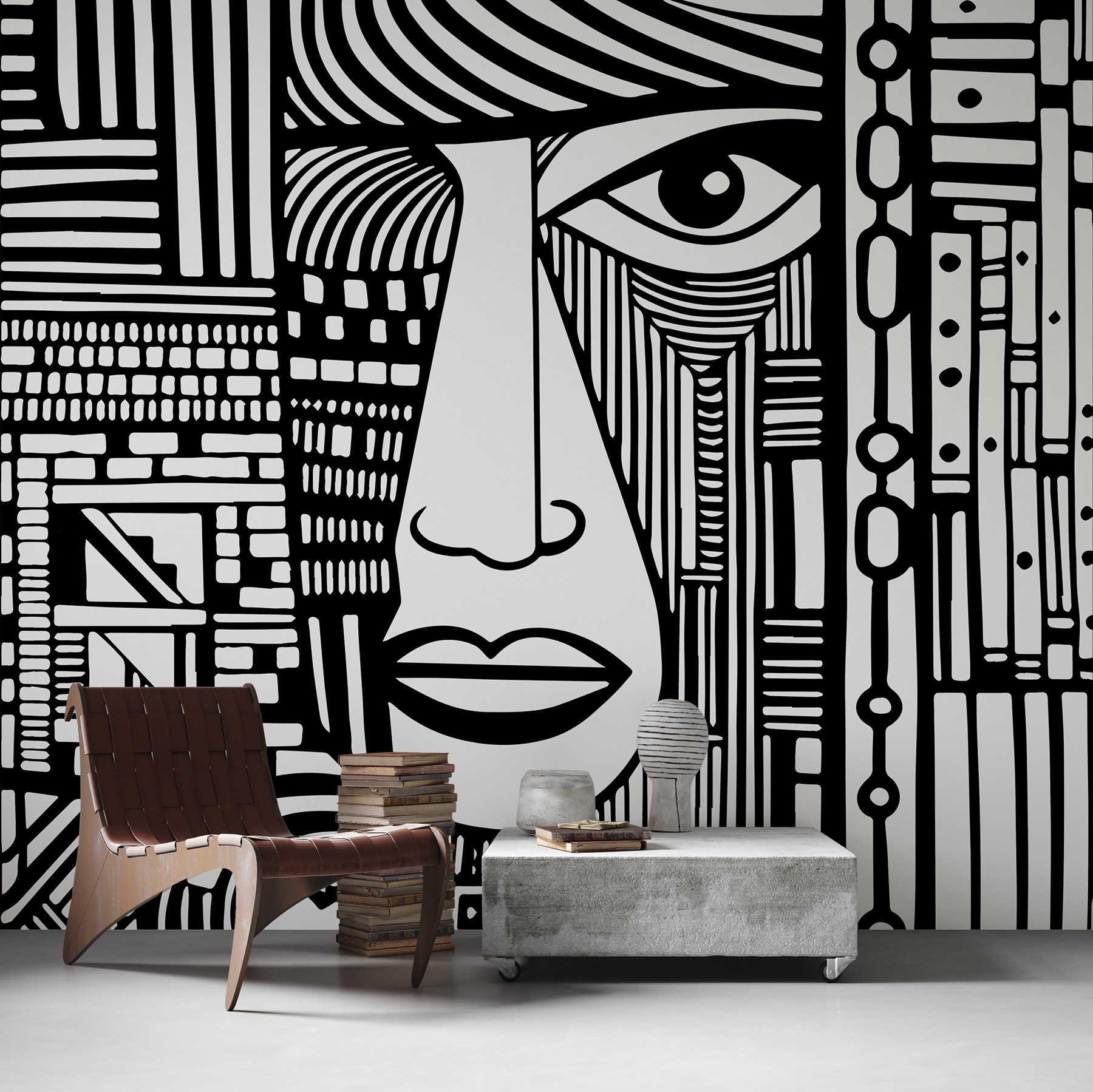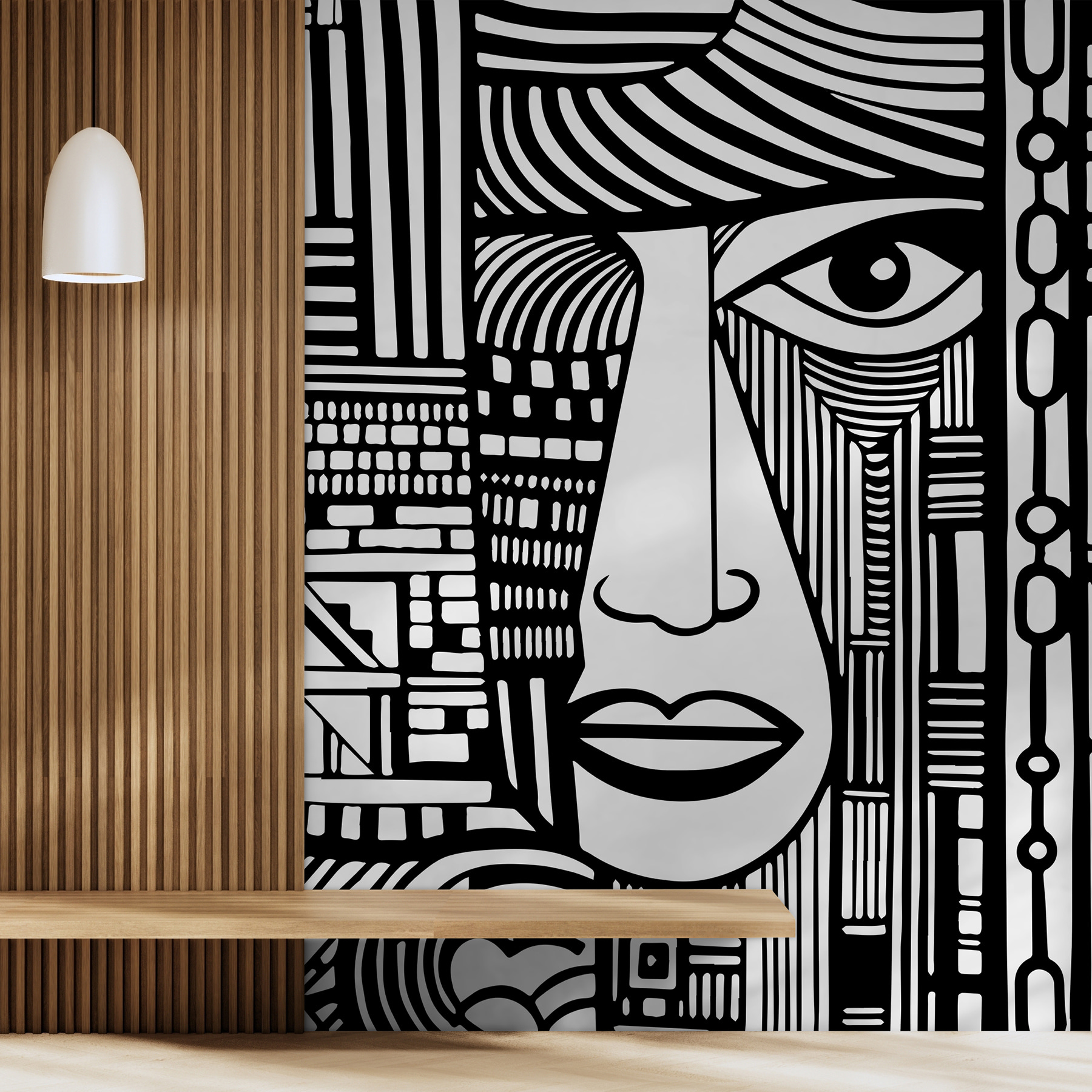 Transform any space with this striking black and white mural that’s more than just decoration—it’s a statement. The unique face, drawn with bold lines and intricate patterns, invites endless interpretations. Imagine walking into a room and being greeted by this captivating piece; it draws you in, sparking curiosity and conversation, like that enchanting stranger at a party.