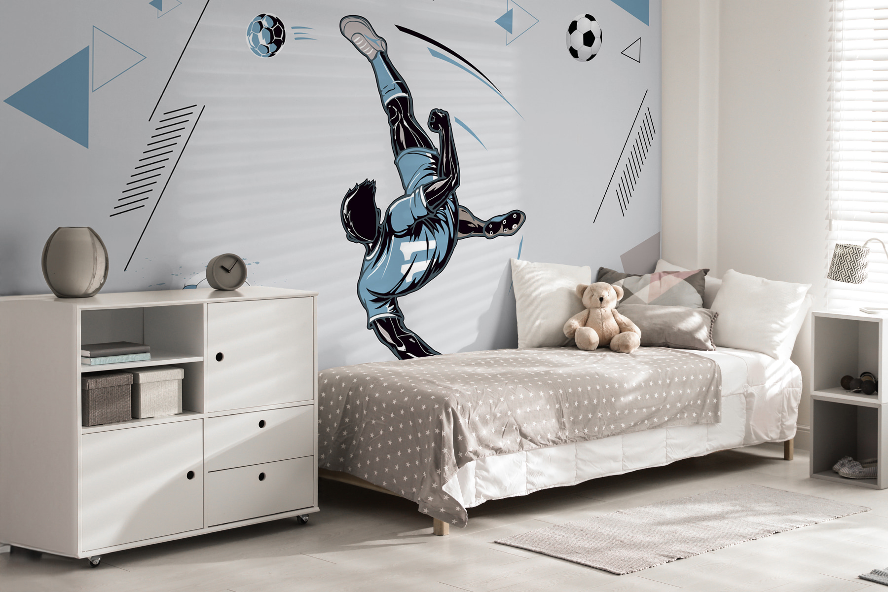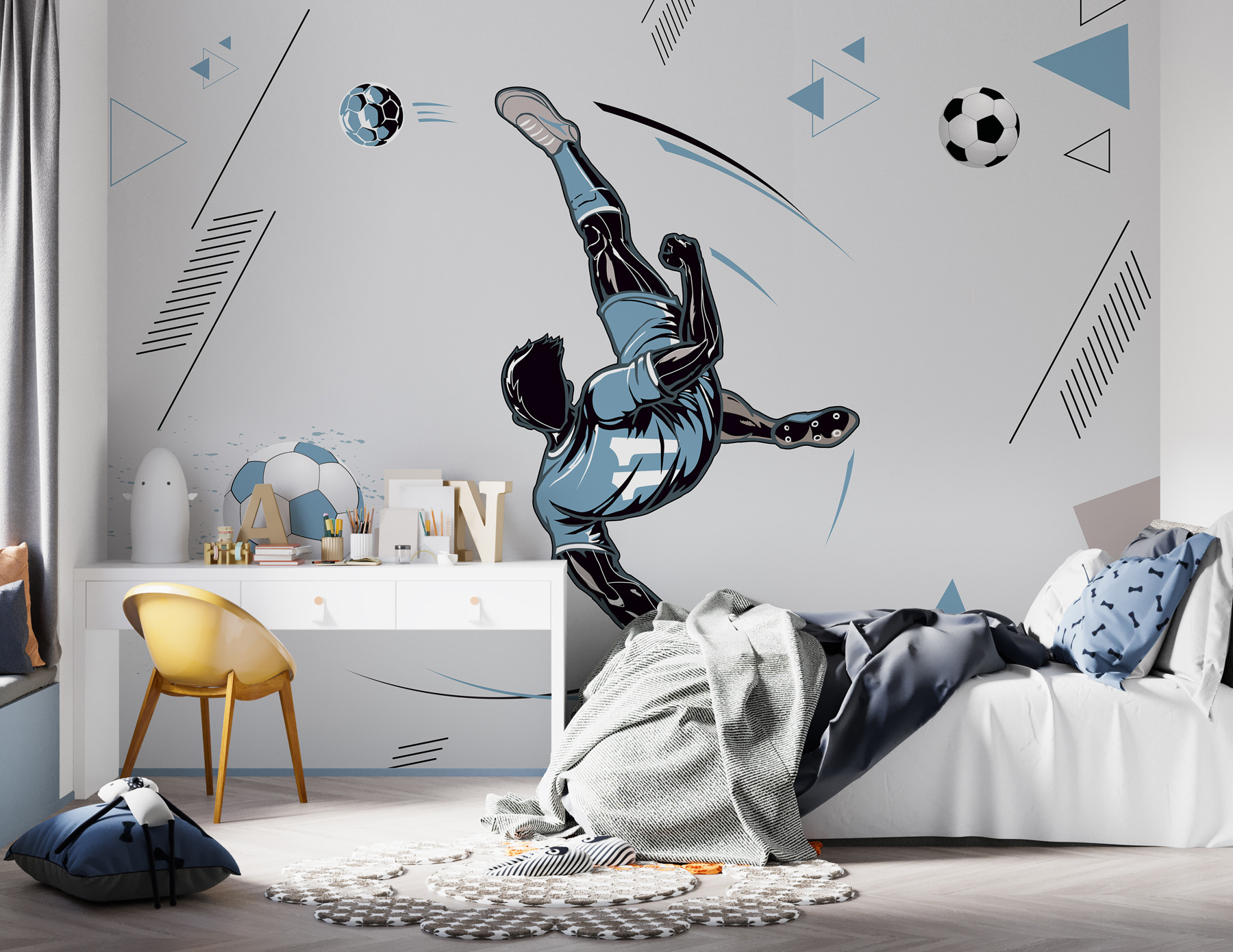 Transform your space with this lively wall mural featuring a soccer player executing a stunning mid-air kick. It’s like inviting the thrill of the game right into your living room! The dynamic design—bold lines and playful geometry—brings a burst of energy that’s perfect for sports enthusiasts or anyone who loves a vibrant touch. Imagine friends gathering, eyes wide, captivated by the action! The mural not only lifts the mood but also sparks conversations. It’s a fun way to celebrate the spirit of the game, making every day feel like match day.