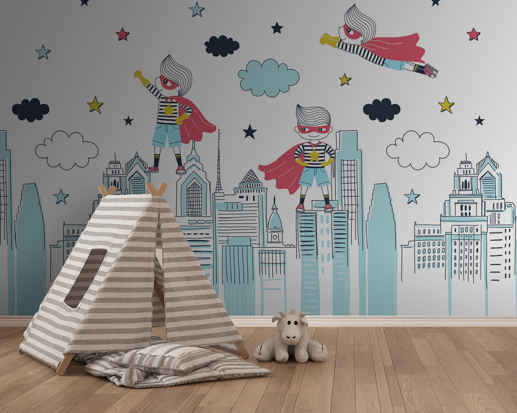 Transform any room into a playful haven with this lively wall mural featuring a dashing superhero on a bright white backdrop. Imagine tiny feet running about, fueled by dreams of soaring through the skies and saving the day—this mural sparks imagination like no other. With whimsical clouds and scattered stars all around, it brings a light-hearted spirit that effortlessly lightens the mood. Perfect for a child’s room or play area, it encourages creativity and adventure every time they glance at it. It’s like having a burst of joy right on the wall, inviting giggles and endless stories about heroics. Keep an eye on that little guy—he might just inspire future adventures!