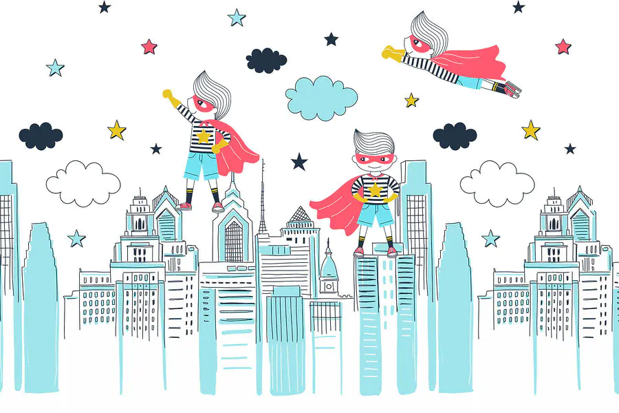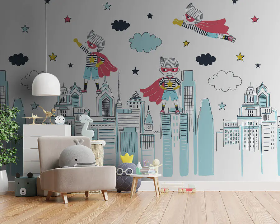 Transform any room into a playful haven with this lively wall mural featuring a dashing superhero on a bright white backdrop. Imagine tiny feet running about, fueled by dreams of soaring through the skies and saving the day—this mural sparks imagination like no other. With whimsical clouds and scattered stars all around, it brings a light-hearted spirit that effortlessly lightens the mood. Perfect for a child’s room or play area, it encourages creativity and adventure every time they glance at it. It’s like having a burst of joy right on the wall, inviting giggles and endless stories about heroics. Keep an eye on that little guy—he might just inspire future adventures!
