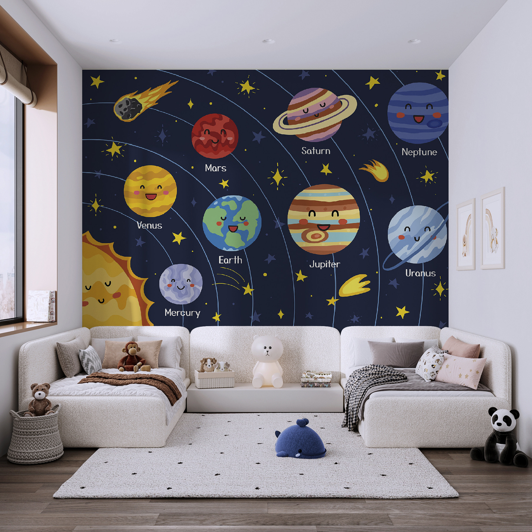Transform any space into a galaxy of fun with this delightful wall mural. Featuring cheerful planets grinning from ear to ear, it’s like having a cosmic party right on your wall. Jupiter’s got that joyful swirl, while Mars looks like it’s ready for a friendly chat. Picture a kid’s room or a playful playroom—this mural brings a sense of wonder and adventure. Every time you walk by, you’ll feel a little lighter, a little more inspired. It’s all laughter and imagination here, with a subtle reminder that the universe is pretty vast but full of joy! Who wouldn’t love a colorful universe just a glance away?