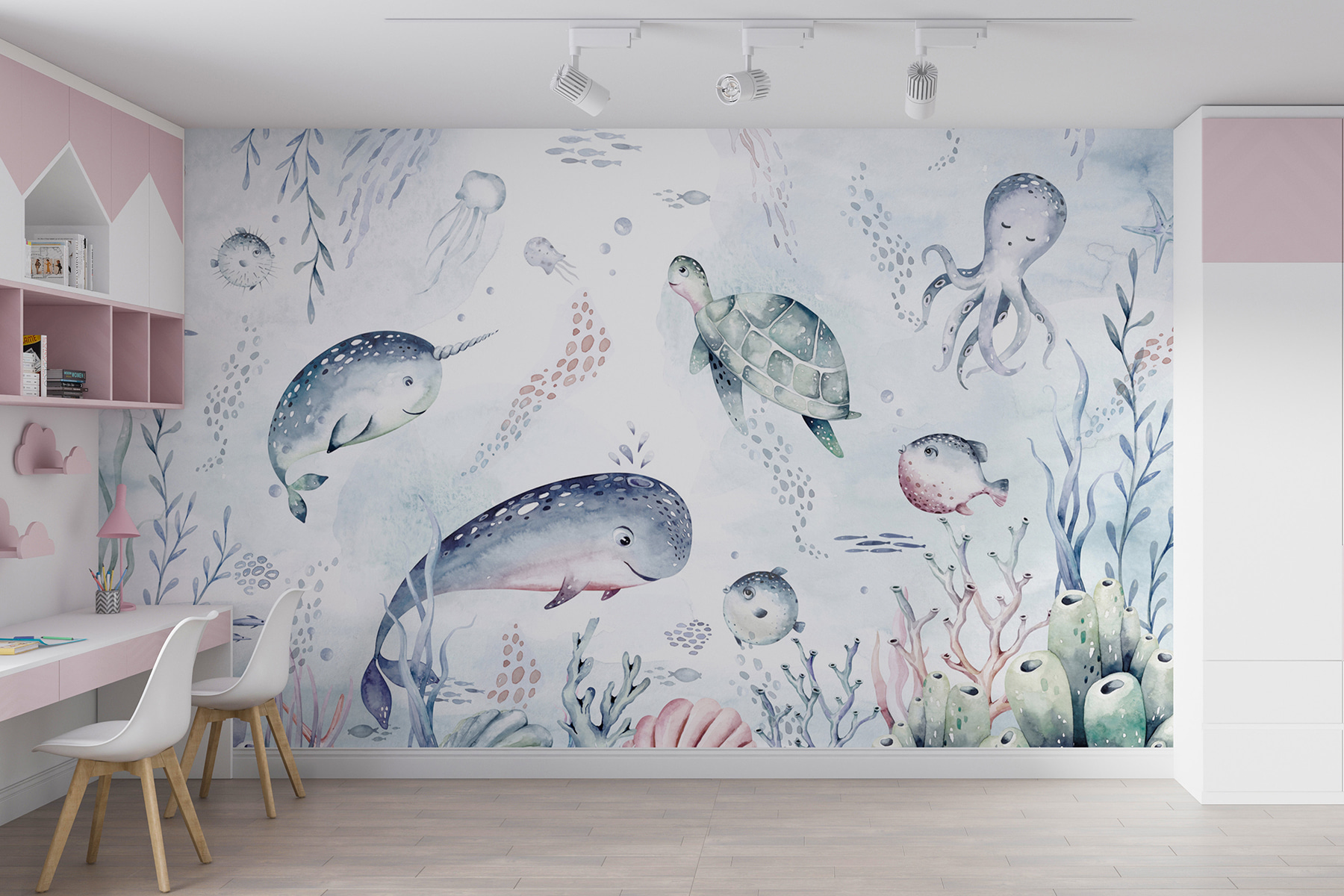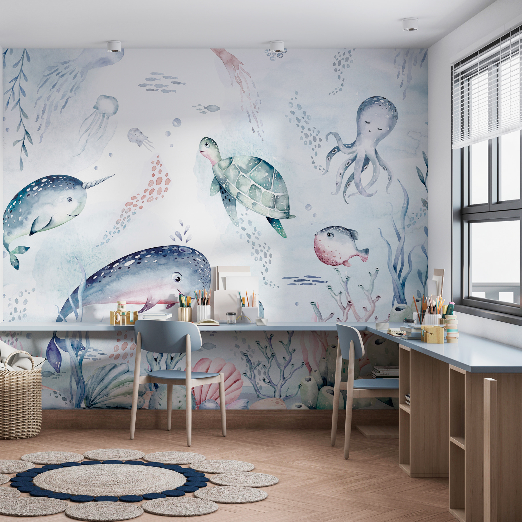 Transform your space into an underwater wonderland with this whimsical watercolor mural featuring cheerful turtles, playful narwhals, and even a curious octopus. Picture it: you walk into the room, and suddenly, it feels like you’re submerged in a gentle ocean breeze, surrounded by shimmering sea life. Each brushstroke brings a splash of color and a hint of laughter—who knew fish could look this adorable? It’s like a friendly visit from the deep blue, making every day feel like a mini-vacation. Perfect for a kid’s room or a cozy corner, this mural invites curiosity and reminds us to embrace a bit of youthful imagination—because who doesn’t want a little ocean magic at home?