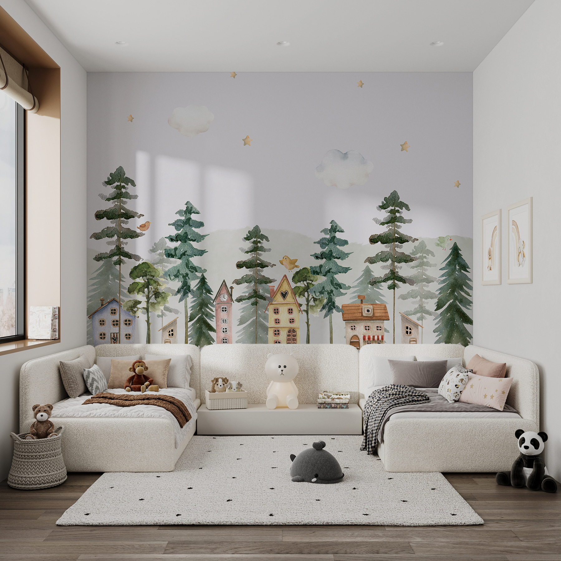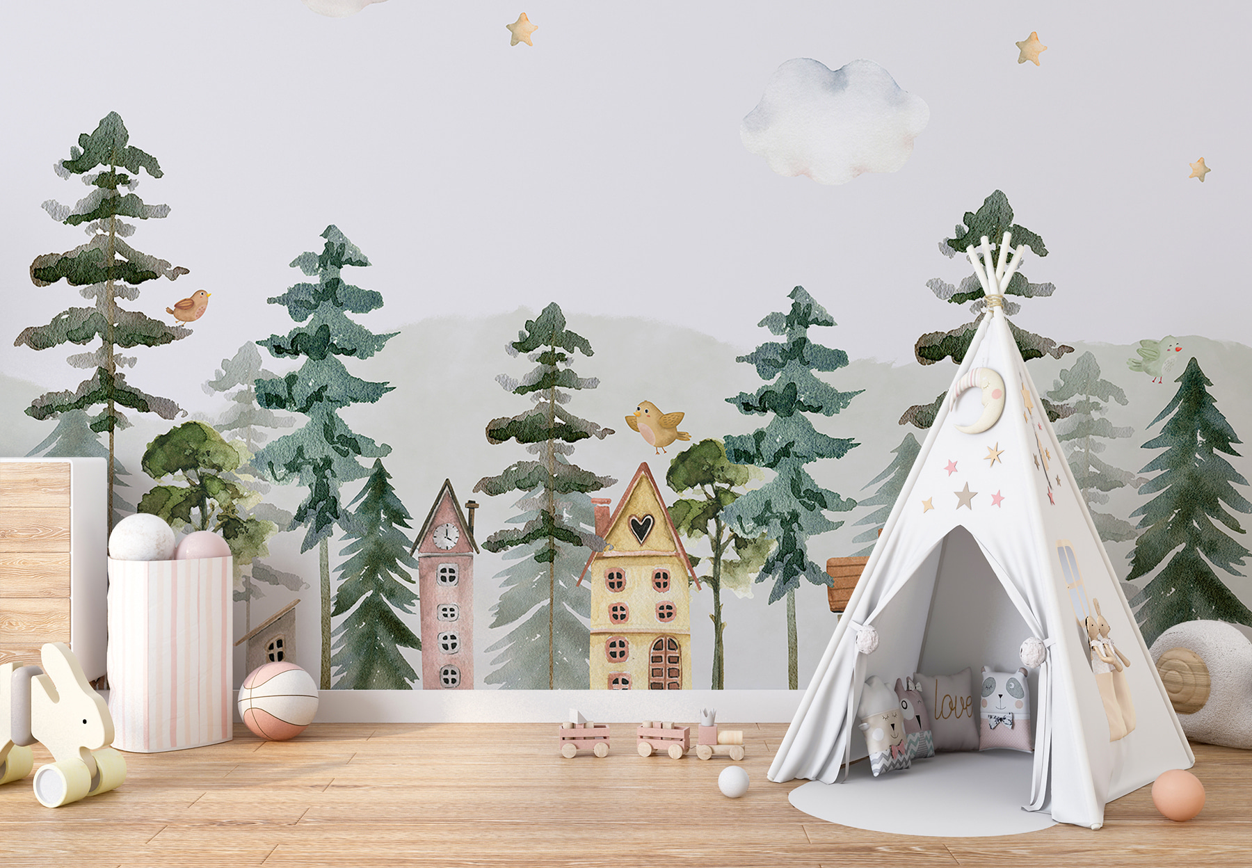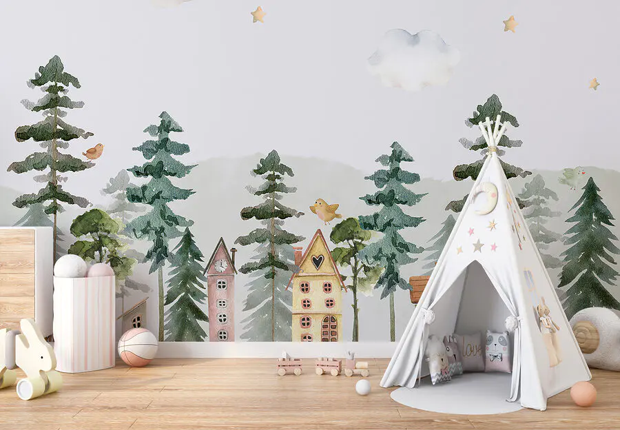 Transform your space into a whimsical retreat with this enchanting watercolor mural. Picture a cozy village under soft clouds and twinkling stars, where each little house tells its own story. It’s like a gentle hug for your walls—perfect for bedrooms, playrooms, or that tiny nook that needs a splash of warmth. Imagine waking up to this cheerful scene, reminding you of lazy Sunday mornings and the sweet sounds of birds chirping nearby. It’s not just decor; it’s a little slice of tranquility waiting to happen. Let your walls invite a bit of magic into your everyday life.