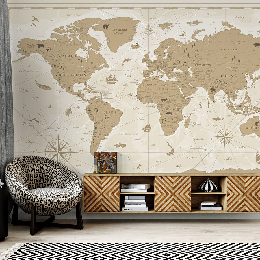 Transform any room into a travel lover’s paradise with this stunning “Map of the World” wall mural. It’s more than just decor; it’s an invitation to dream. Picture sipping coffee while planning your next adventure, gazing at beautifully illustrated countries and whimsical sea creatures. The warm, earthy tones create a cozy, inviting atmosphere, making it perfect for a living room or study. Friends might just find themselves tracing paths with their fingers, giggling about wild vacation ideas—who wouldn’t want to explore the world, one wall at a time? Let this mural inspire wanderlust and spark those delightful daydreams of sandy beaches and mountain hikes!