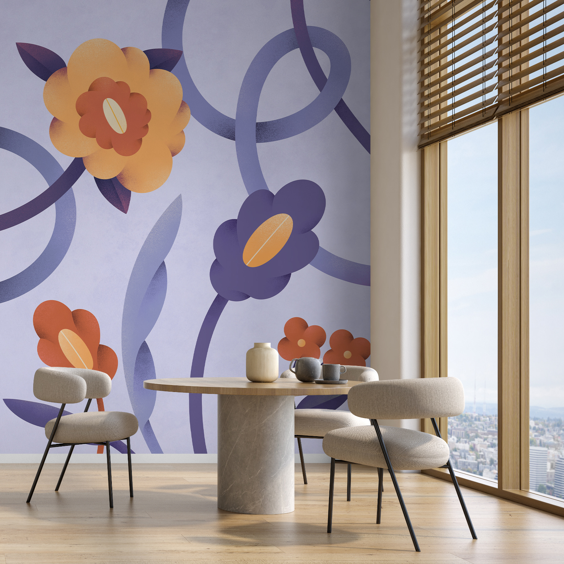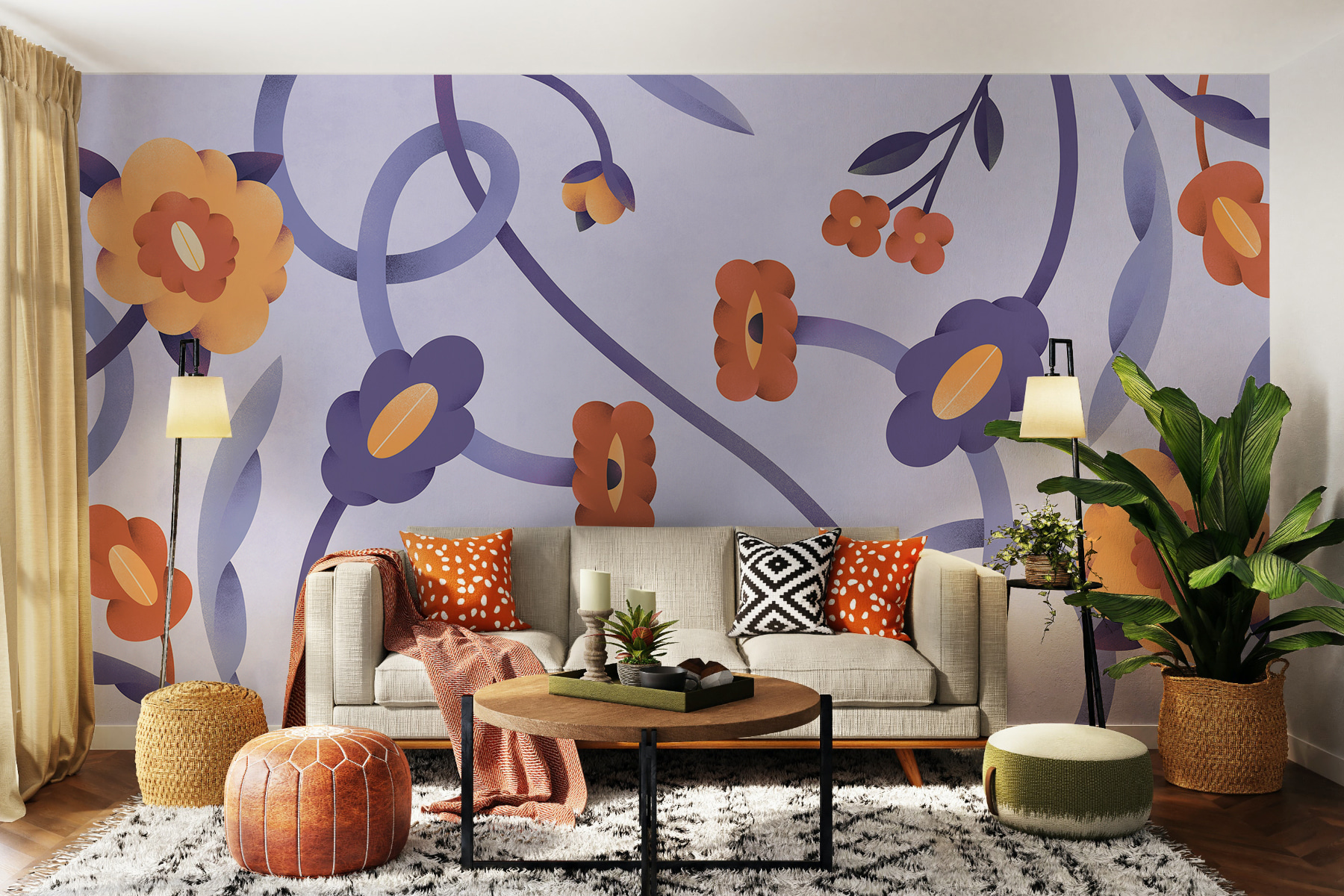 Transform any room with this vibrant wall mural featuring purple and orange flowers winding playfully across a soft lavender background. It’s like a garden party for your walls—who wouldn’t want that? Each bloom seems to cheerfully burst forth, inviting a touch of nature indoors without all the fuss of caring for real plants. Imagine sipping coffee surrounded by this lively decor, feeling inspired every day. Perfect for a cozy nook or to add a splash of joy in a kids’ room. Who knew wallpaper could be so much fun? Bring on the good vibes!
