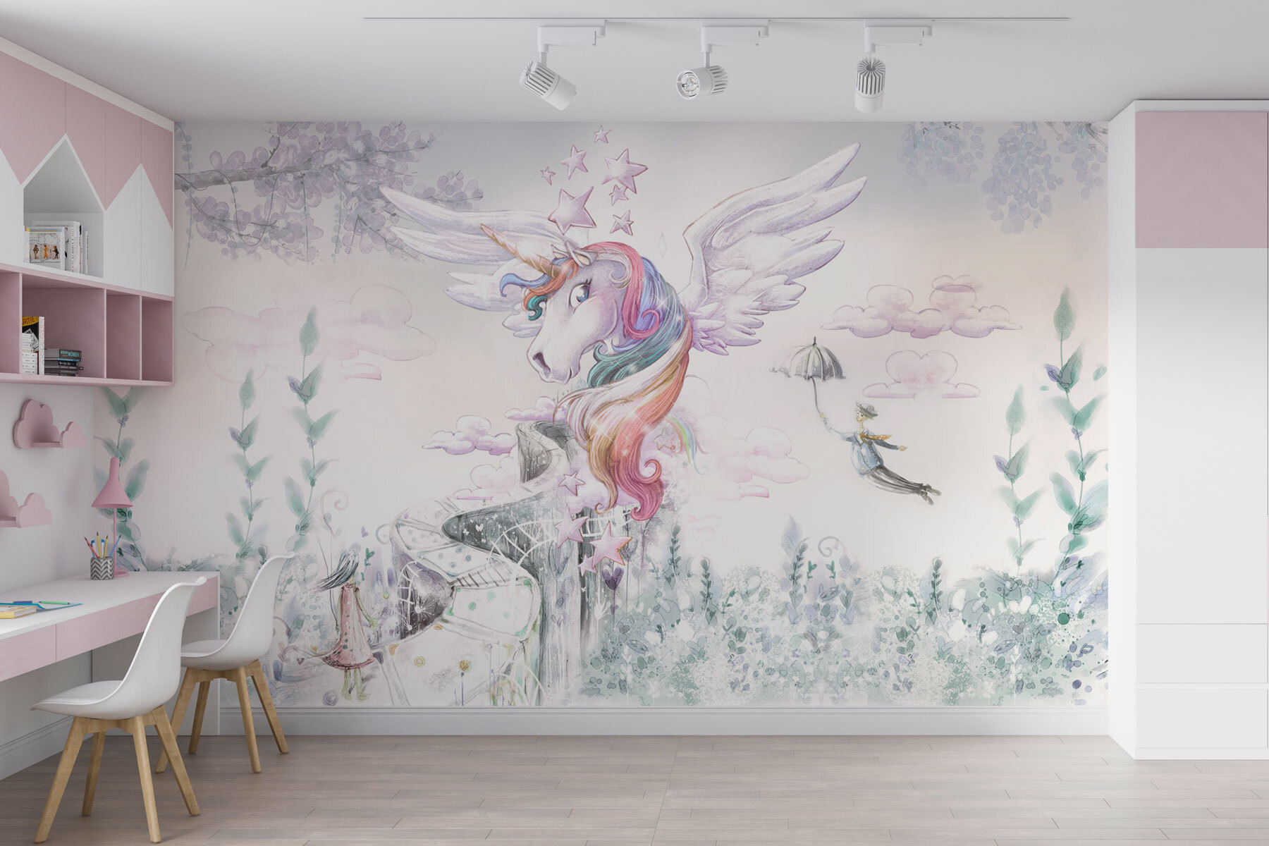 Transform your space into a whimsical wonderland with this enchanting wall mural featuring a unicorn with wings and rainbow hair. Imagine stepping into a dreamy realm where colors swirl and magic floats in the air. The delicate pastel hues create a serene backdrop, perfect for sparking imagination. Picture it in a kid’s room or even a cozy reading nook—because who doesn’t want to be inspired by a flying unicorn? This mural isn’t just decor; it’s an invitation to dream, to play, and to escape into a world where anything is possible. Plus, it’s sure to be a conversation starter! Get ready for the compliments to roll in as this marvelous piece brings a touch of fantasy into everyday life.