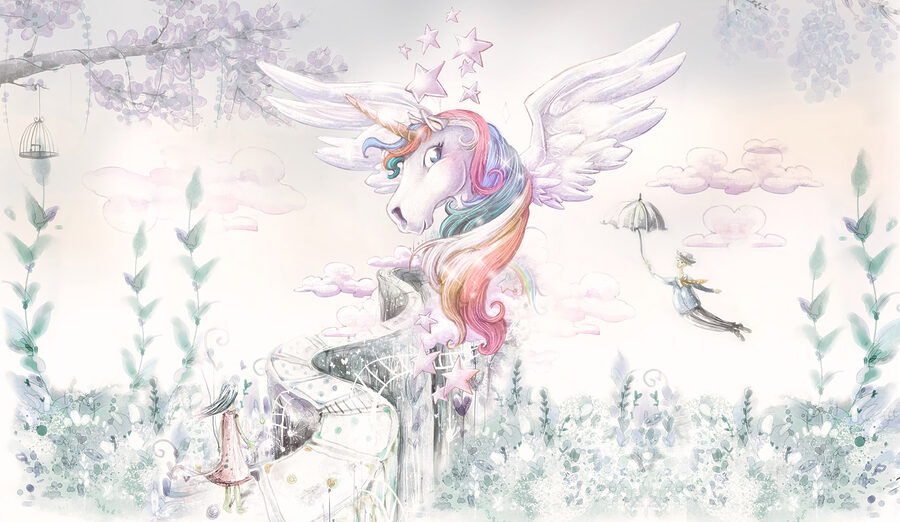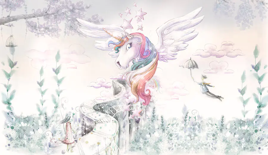 Transform your space into a whimsical wonderland with this enchanting wall mural featuring a unicorn with wings and rainbow hair. Imagine stepping into a dreamy realm where colors swirl and magic floats in the air. The delicate pastel hues create a serene backdrop, perfect for sparking imagination. Picture it in a kid’s room or even a cozy reading nook—because who doesn’t want to be inspired by a flying unicorn? This mural isn’t just decor; it’s an invitation to dream, to play, and to escape into a world where anything is possible. Plus, it’s sure to be a conversation starter! Get ready for the compliments to roll in as this marvelous piece brings a touch of fantasy into everyday life.