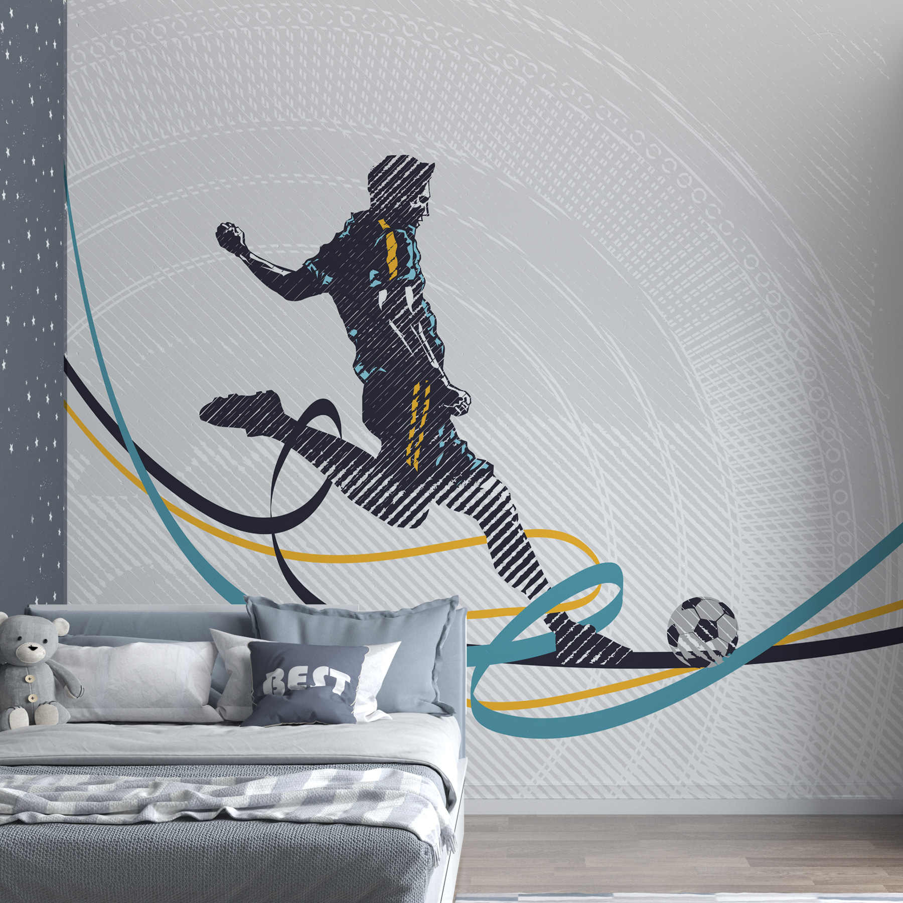 Transform your space with a vibrant wall mural that captures the thrill of a player kicking a football! This eye-catching piece, with its dynamic lines and bold colors, screams energy and excitement—perfect for sports enthusiasts or anyone who loves a little zest in their decor. Imagine walking into a room and feeling that rush of adrenaline, like you’re right there on the pitch. It’s a conversation starter for sure. Plus, it adds a splash of personality that plain walls just can’t match! Perfect for a game room, nursery, or anywhere that could use a bit of playful spirit.