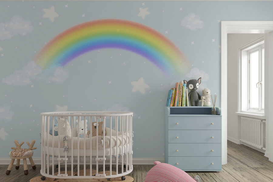 Looking to add a sprinkle of charm to your space? This charming mural, “White Star on a Blue Background,” offers a playful escape into a dreamy world. Picture this: your walls transformed into a tranquil sky dotted with soft clouds and twinkling stars. It’s like bringing a piece of the peaceful outdoors inside, minus the pesky insects.