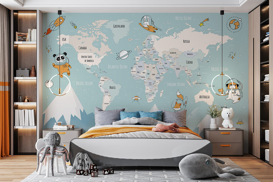 Transform any space with this whimsical “Map of the World with Mountains and Clouds” mural! Imagine glancing at this vibrant scene and instantly feeling inspired to explore new places. Those cheeky critters floating in space add a playful twist, perfect for sparking conversations. It’s not just a map; it’s a ticket to daydreams of far-off lands and mountain adventures. The soft blues and charming illustrations create a relaxing vibe, making it a hit in kids’ rooms, play areas, or even a cozy reading nook. Say goodbye to boring walls and hello to a burst of imagination!