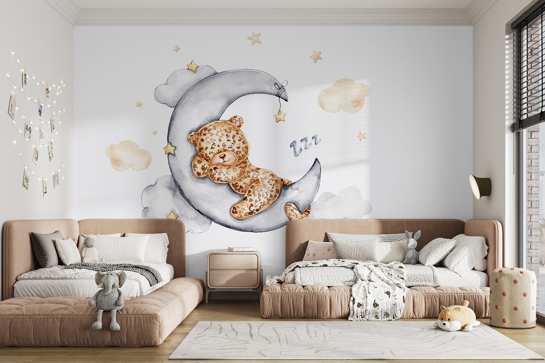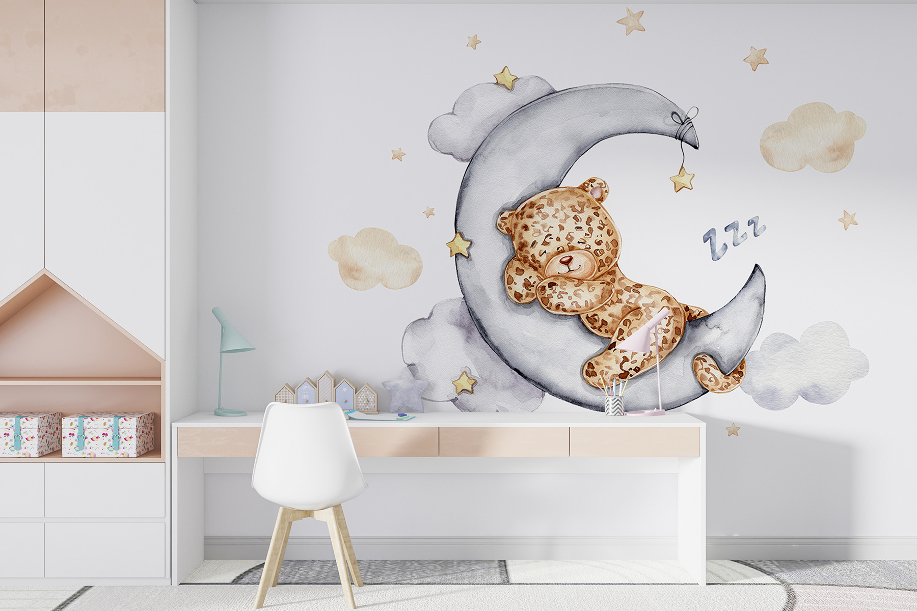 Transform your space with this adorable wall mural featuring a teddy bear snoozing peacefully on the moon. It’s like bringing a gentle bedtime story right into your room! Imagine a cozy, serene atmosphere where dreams float as softly as the clouds around him. The soft palette of grays and warm browns gives off a sweet vibe, making it perfect for nurseries or playrooms. This mural’s whimsical charm adds a sprinkle of magic, inviting smiles and daydreams. Who wouldn’t want a fuzzy friend keeping watch at night? It’s almost like he’s saying, “Shhh… sweet dreams await!” Perfect for anyone looking to add a touch of wonder to their walls.