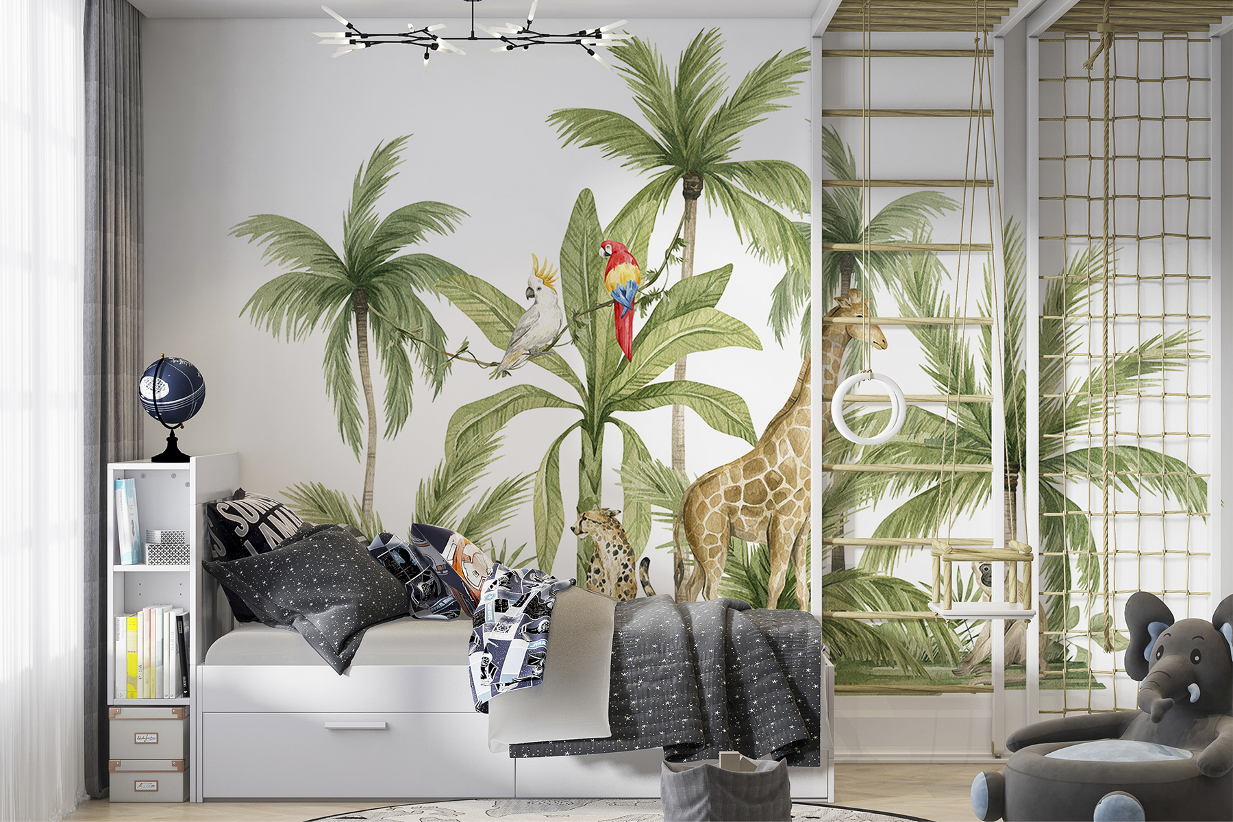 Dive into the jungle with this lively mural, featuring playful giraffes, exotic birds, and that mischievous monkey who’s clearly up to something! It’s like having a mini safari right in your living room. Imagine the kids’ faces lighting up or your guests doing a double take—it’s a conversation starter for sure. Bright greens and earthy tones create a refreshing atmosphere, making any space feel more alive. Whether it’s for a cozy nook or a vibrant playroom, this mural adds a touch of wild charm and whimsy. Who wouldn’t want a piece of the jungle in their home? Plus, it might just make your walls the envy of all your pals!
