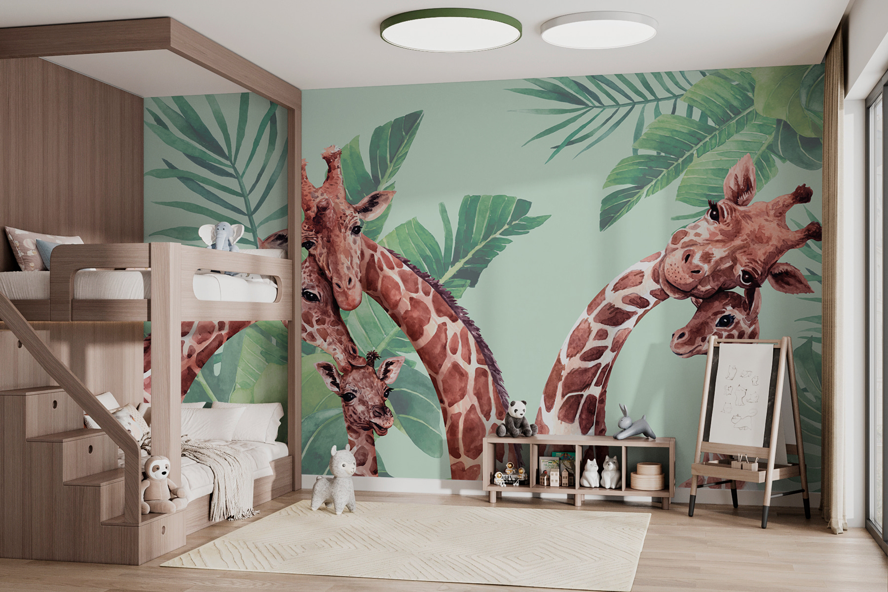 Transform your space with this delightful mural featuring playful giraffes against a refreshing green backdrop. Imagine walking into a room whose walls whisper tales of the savannah—each giraffe seems to nuzzle and interact, bringing a sense of warmth and whimsy. Perfect for a nursery, living room, or anywhere in need of a splash of personality. Those charming spots and long necks are sure to spark joy and conversation, making it hard not to smile. It’s like having a happy little safari at home, effortlessly brightening your everyday life!