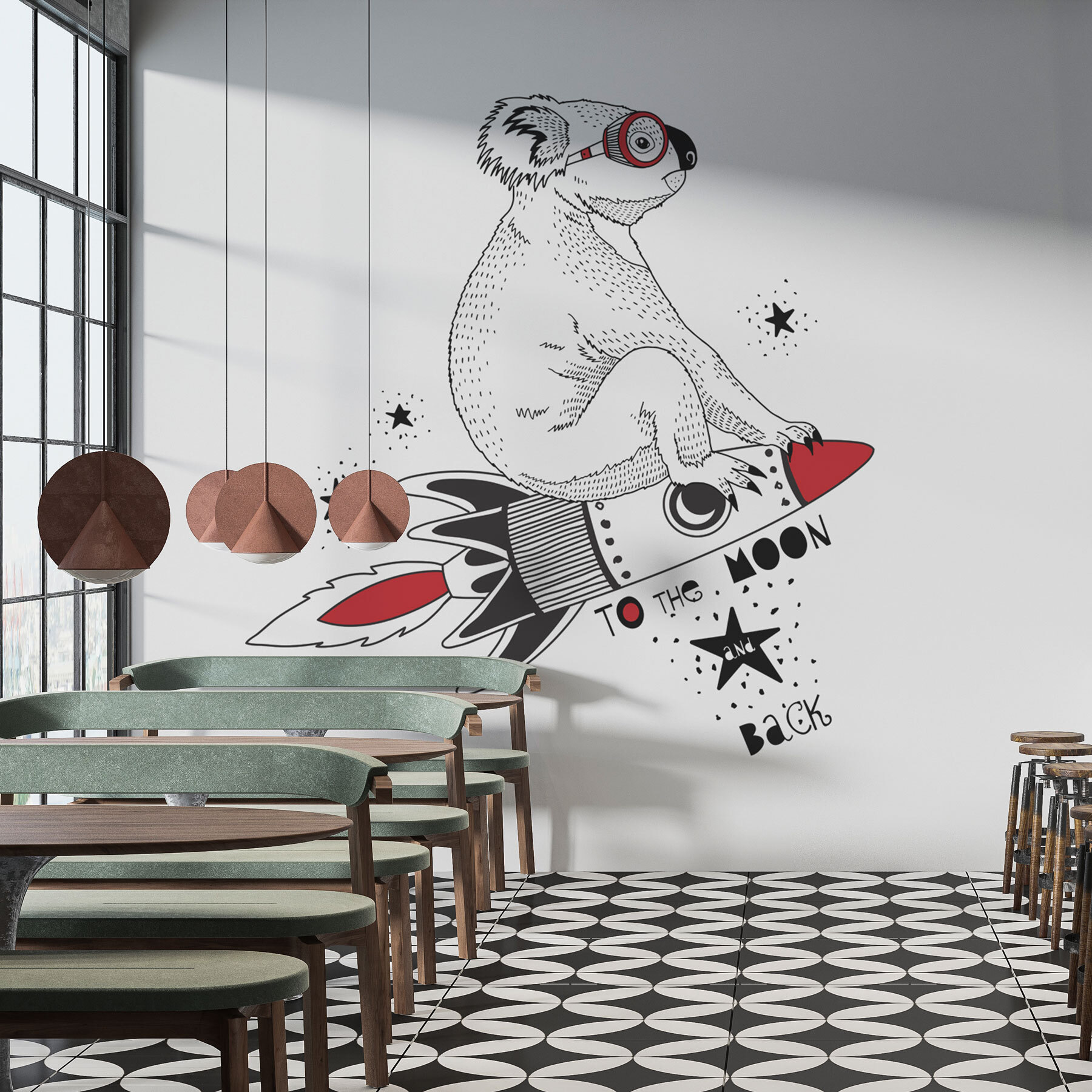 Transform a plain wall into a whimsical adventure with the “Koala on a Rocket” mural. Imagine a fluffy koala, goggles on, zooming through the stars—it’s like a delightful daydream! This mural brings a splash of fun and character to any space, perfect for sparking joy in a kid’s room or adding a quirky touch to a living area.
