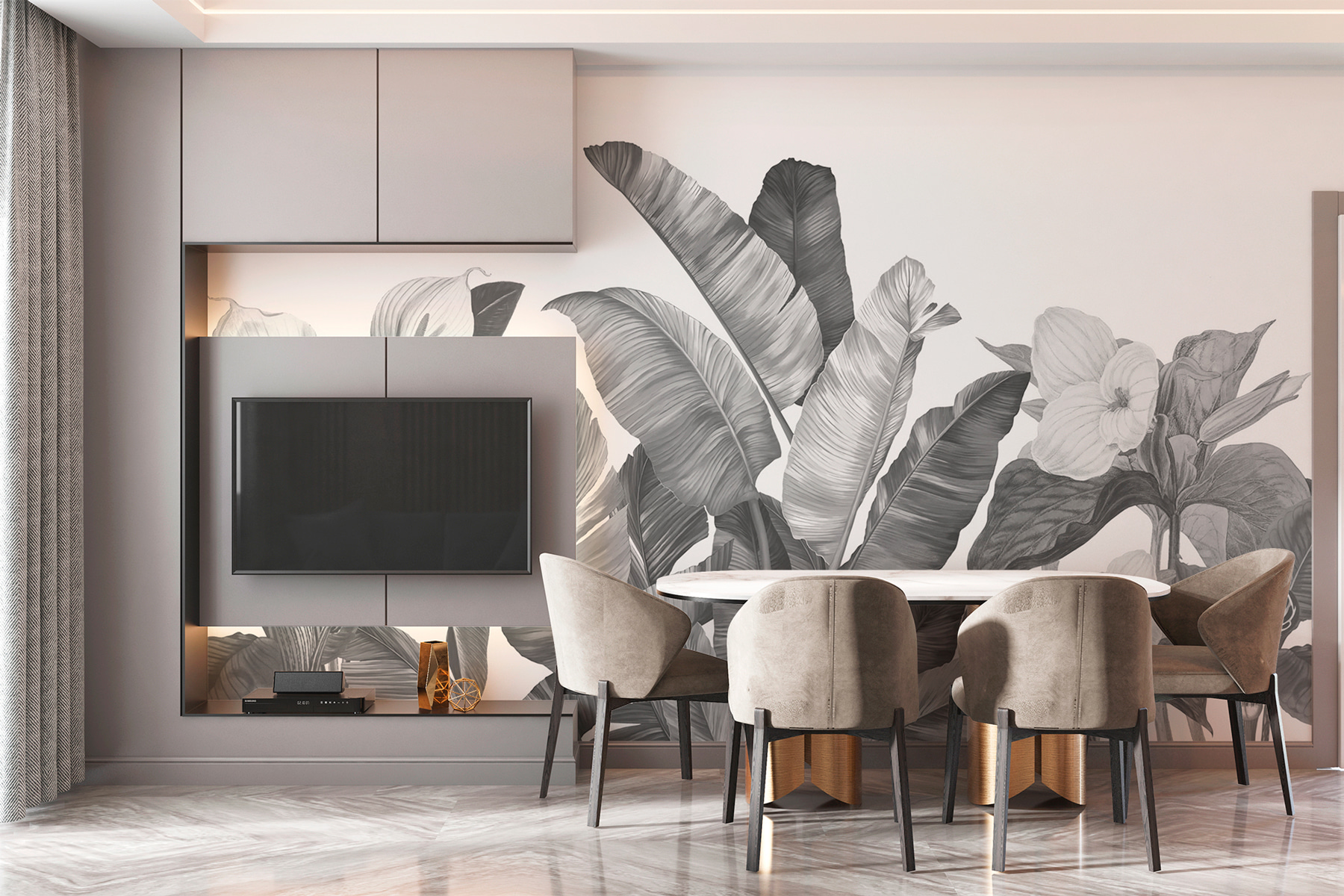 Transform any room into a serene oasis with this “Monochrome Tropical Leaves and Blooms” mural. Picture it: those gorgeous leaves and delicate blooms creating a stunning focal point, instantly up-leveling your space. It’s like bringing a bit of the jungle indoors, but without the humidity and mosquitoes—bonus! The soft shades of gray provide a cool, calm vibe, making it perfect for a cozy reading nook or a stylish living area. Friends will swoon. Just imagine a sunny afternoon, a cup of tea in hand, and this mural wrapping around you like a gentle hug, whispering, “You’re in paradise, my friend.” Perfect for nature lovers who appreciate a touch of elegance!