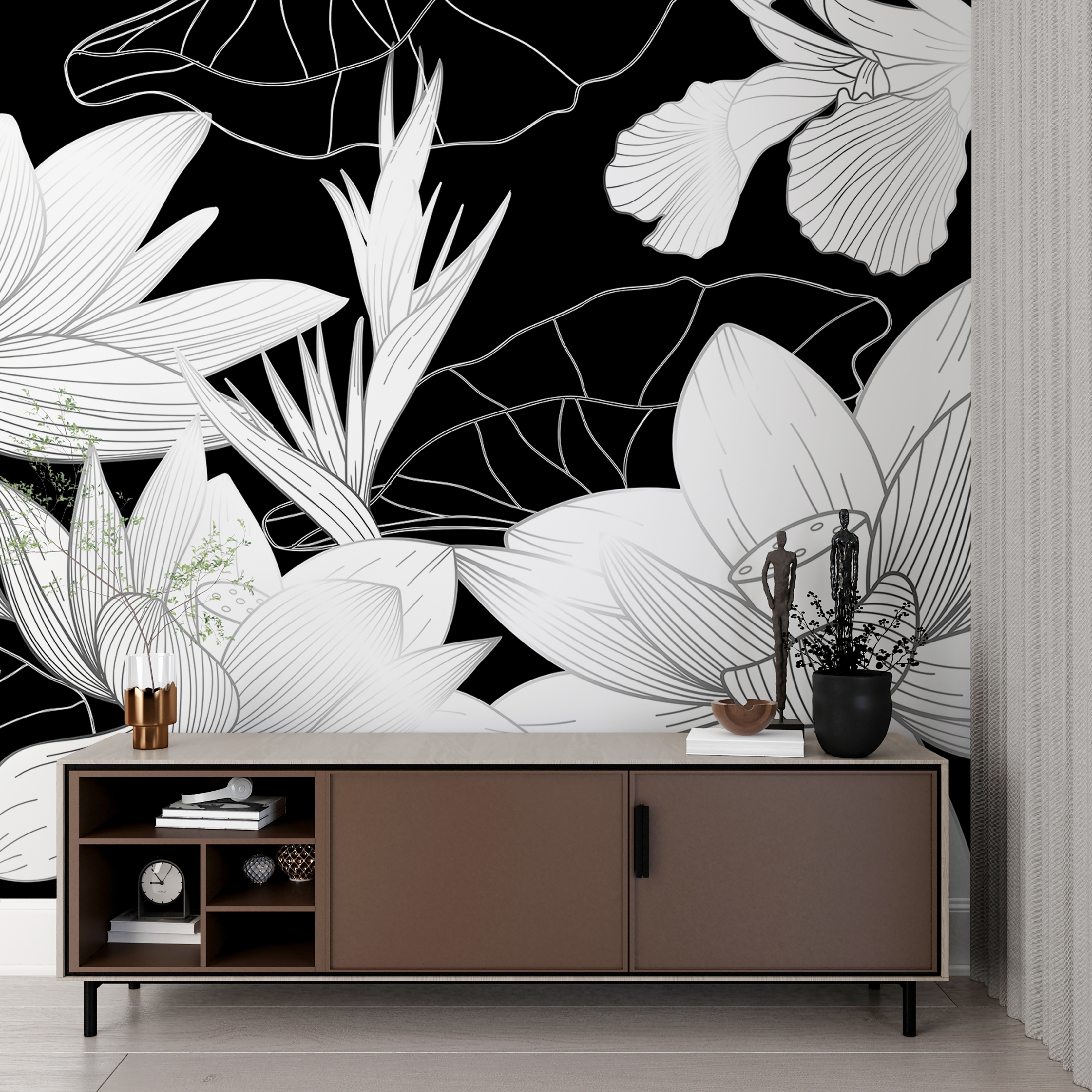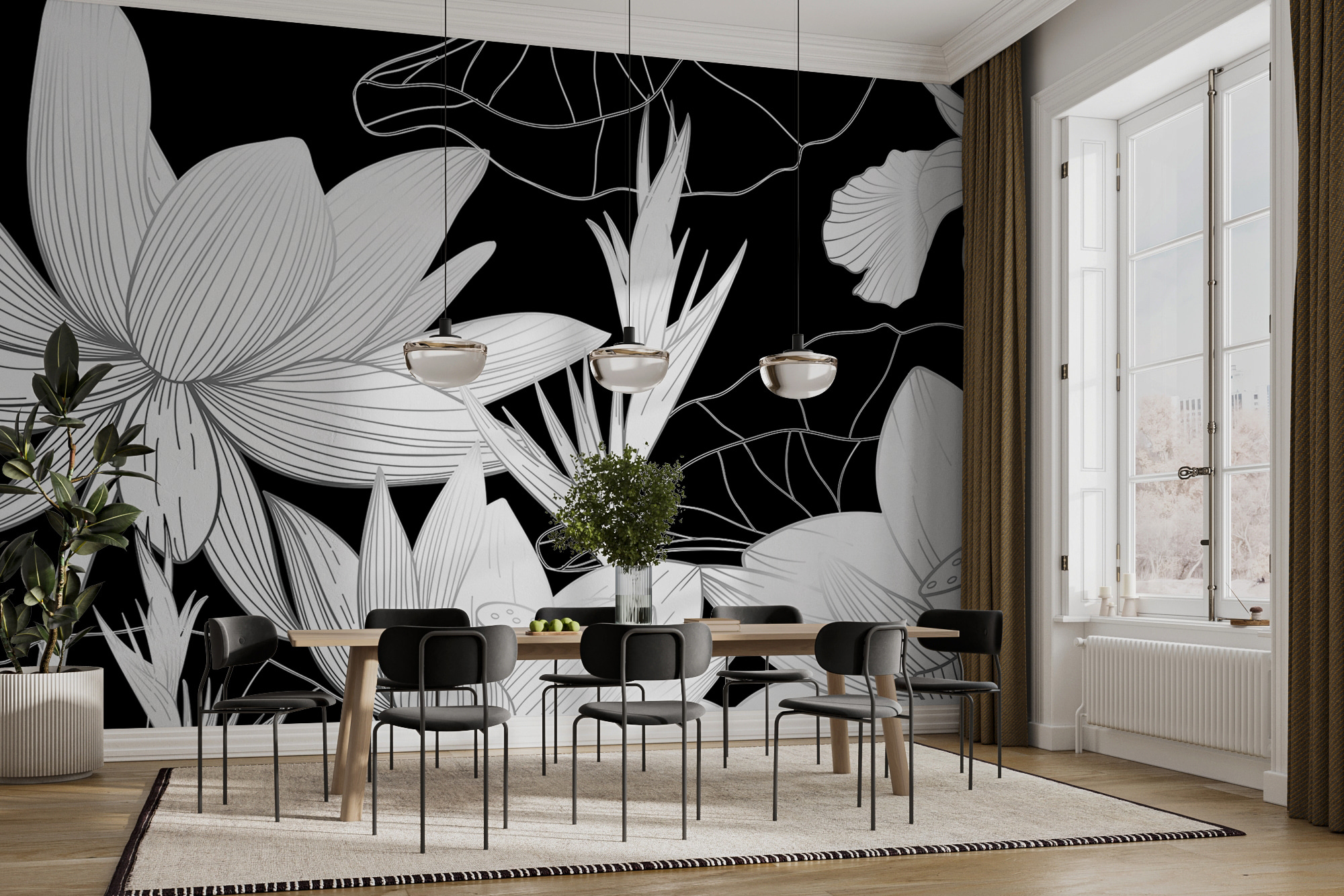 Transform your space with this stunning black and white floral wall mural. It’s like inviting a breath of fresh air—or maybe a garden party—right into your living room! The elegant lines weave together a symphony of floral designs that gently dance on a dark backdrop, creating a striking contrast that catches the eye. Imagine sitting back with a cup of coffee, feeling inspired by the artistry, or maybe plotting your next big idea while surrounded by nature’s beauty. This mural adds a touch of sophistication while staying effortlessly cool. Perfect for anyone looking to add a unique flair without all the fuss. Seriously, it’s like a canvas of calm that can make even the busiest spaces feel a bit more relaxed. So, why not let these flowers bring some character into your walls? They’d be thrilled to make a statement!