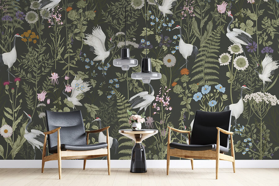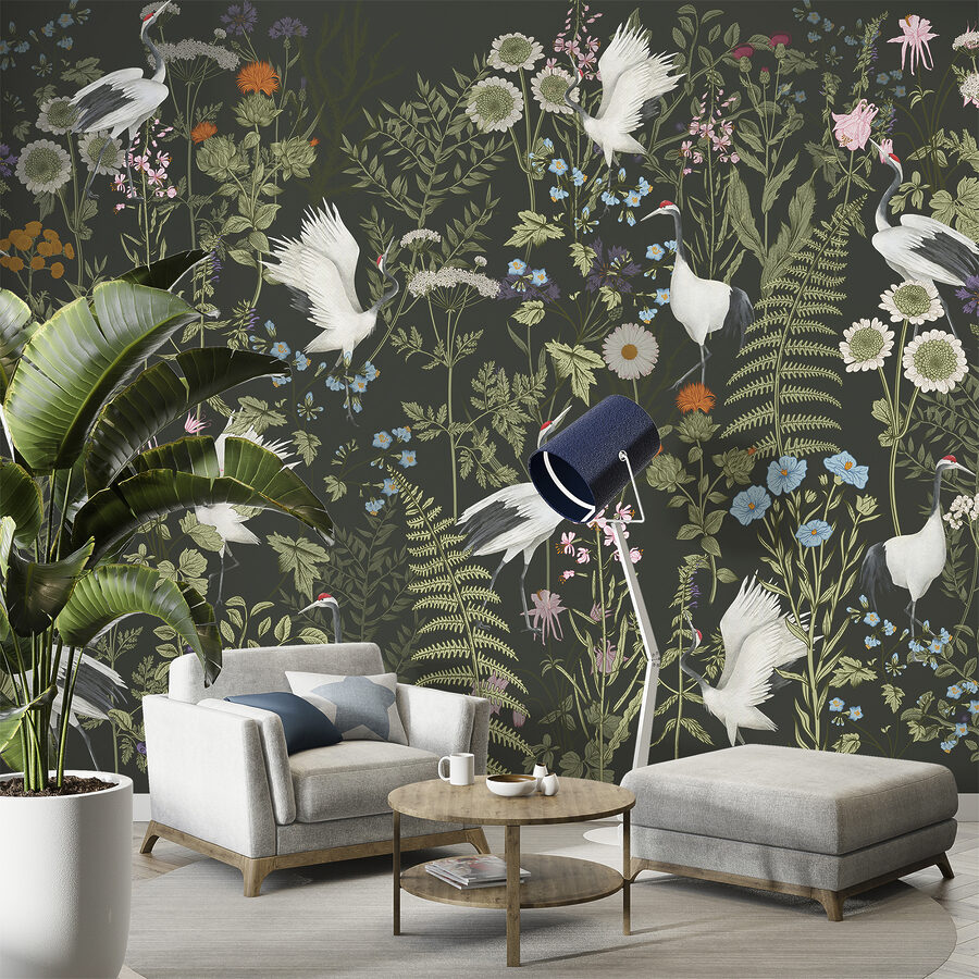 Transform your space with this stunning wall mural featuring elegant birds and lush flowers. Imagine walking into a room that feels like stepping into a serene garden, where vibrant colors dance on the walls. The intricate design, with delicate blooms and graceful cranes, brings nature indoors—perfect for those who want a hint of the outdoors without the fuss of watering plants.