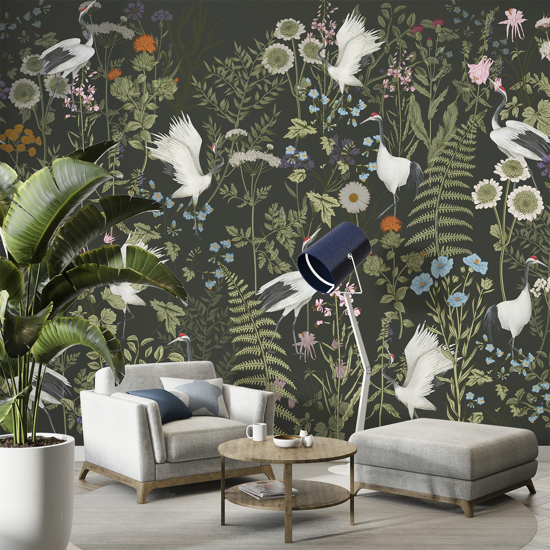 Transform your space with this stunning wall mural featuring elegant birds and lush flowers. Imagine walking into a room that feels like stepping into a serene garden, where vibrant colors dance on the walls. The intricate design, with delicate blooms and graceful cranes, brings nature indoors—perfect for those who want a hint of the outdoors without the fuss of watering plants.