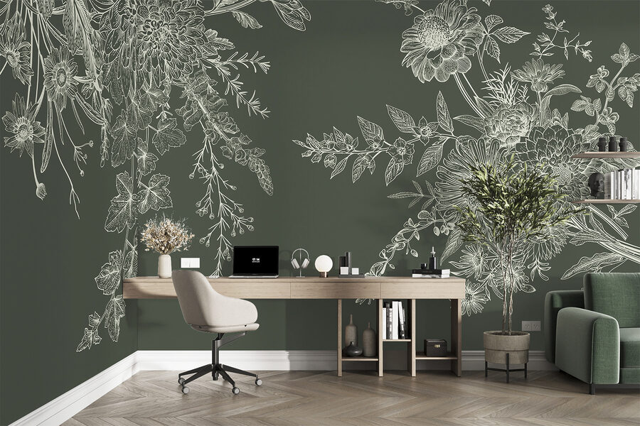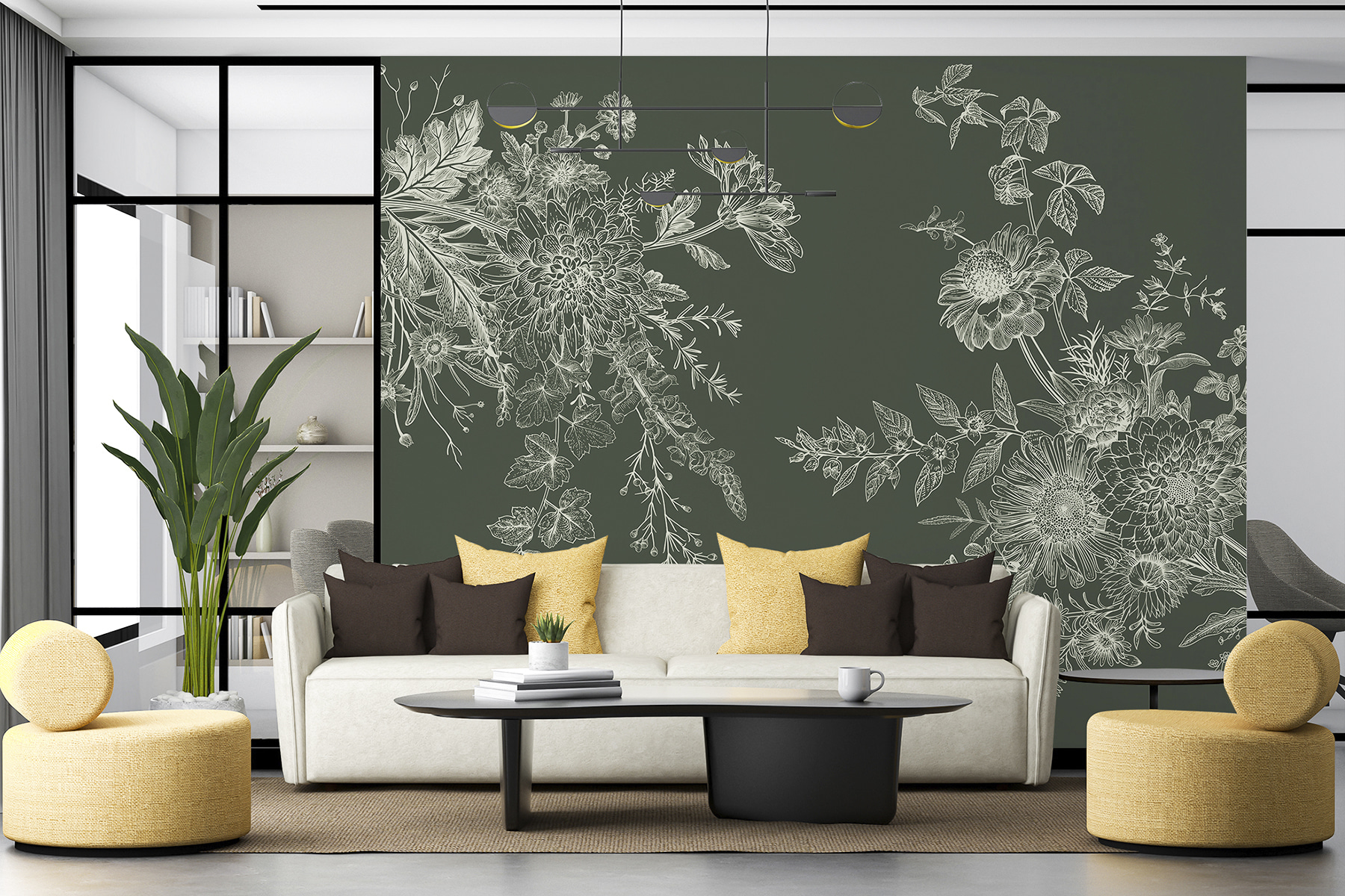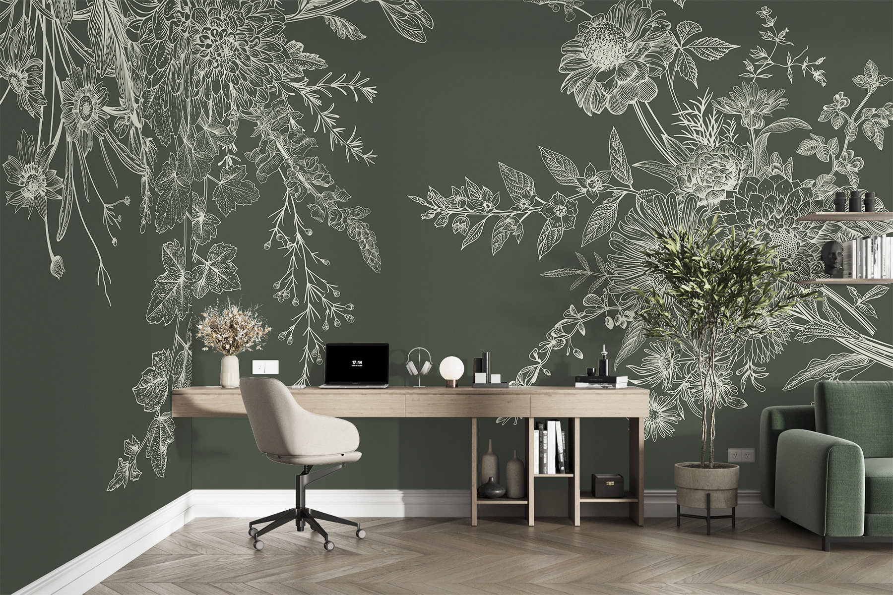 Transform a dull wall into a blooming masterpiece with this elegant floral mural. Set against a deep, dark backdrop, the intricate white sketches of flowers and foliage pop with life, adding a touch of nature’s charm to any room. Imagine sipping coffee in a cozy corner, surrounded by these lovely blooms that seem to dance off the walls. It’s like bringing a secret garden indoors, where every glance offers a little joy. Perfect for those moments when you need a daydream escape or just want to impress friends with your unique style. Who knew decorating could feel this vibrant?